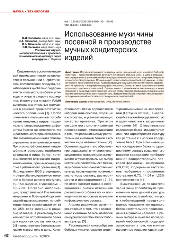 Изучена возможность замены части пшеничной муки мукой из бобовой культуры – чины посевной (на 30 и 50% от общего объёма муки) с целью повышения содержания усваиваемого белка и улучшения питательности получаемой мучной кондитерской продукции. Получены результаты анализа готовой продукции – классического песочного печенья, подтверждающие улучшение биохимических характеристик продукта – в первую очередь растительного белка, а также повышение оценки органолептических показателей. Сделан вывод о возможности внесения муки чины посевной в рецептуру изготовления мучной кондитерской продукции с сохранением привлекательности по всем параметрам. Выделен наиболее перспективный вариант продукции с чиной в составе по совокупности показателей.