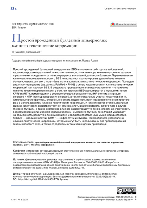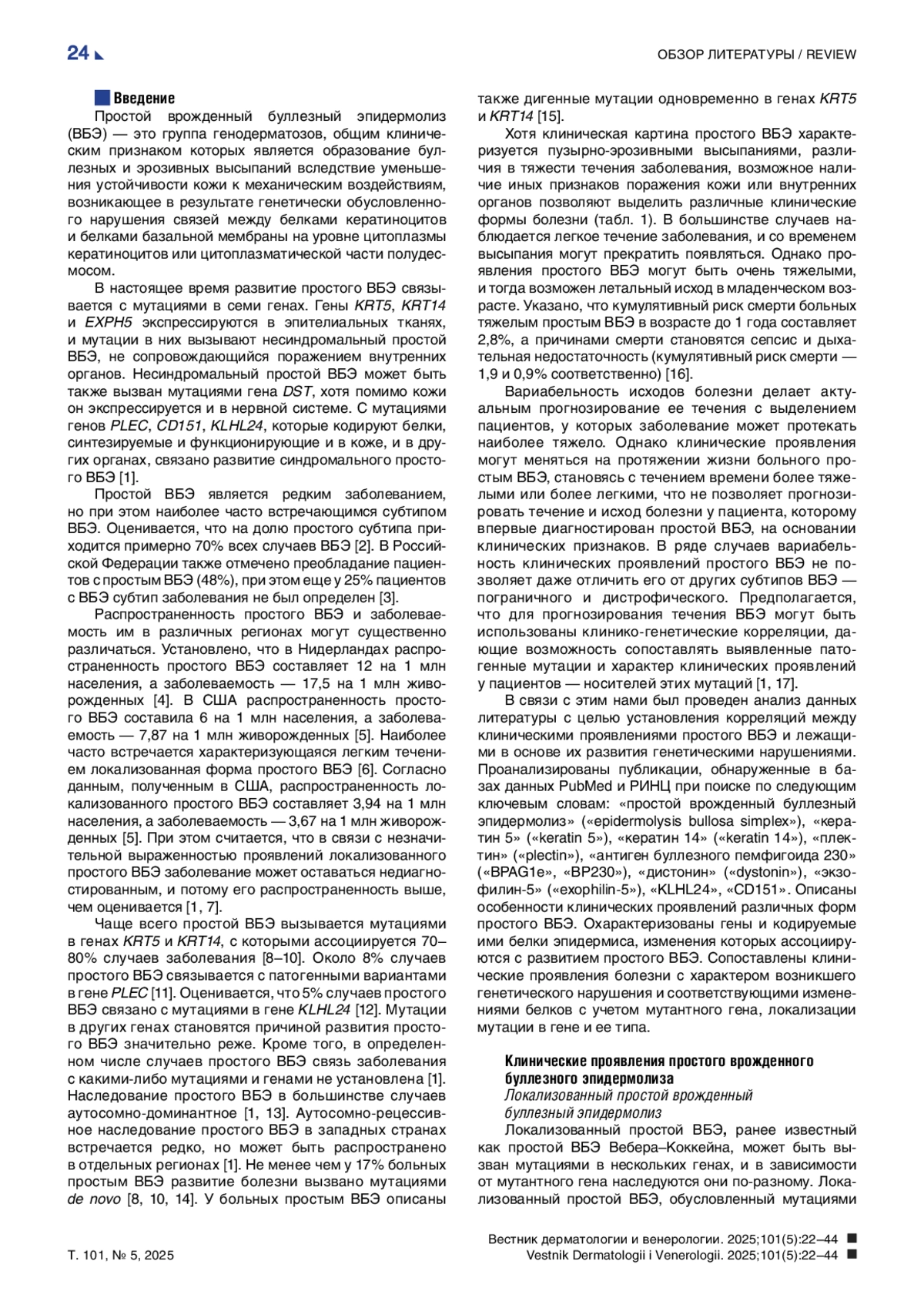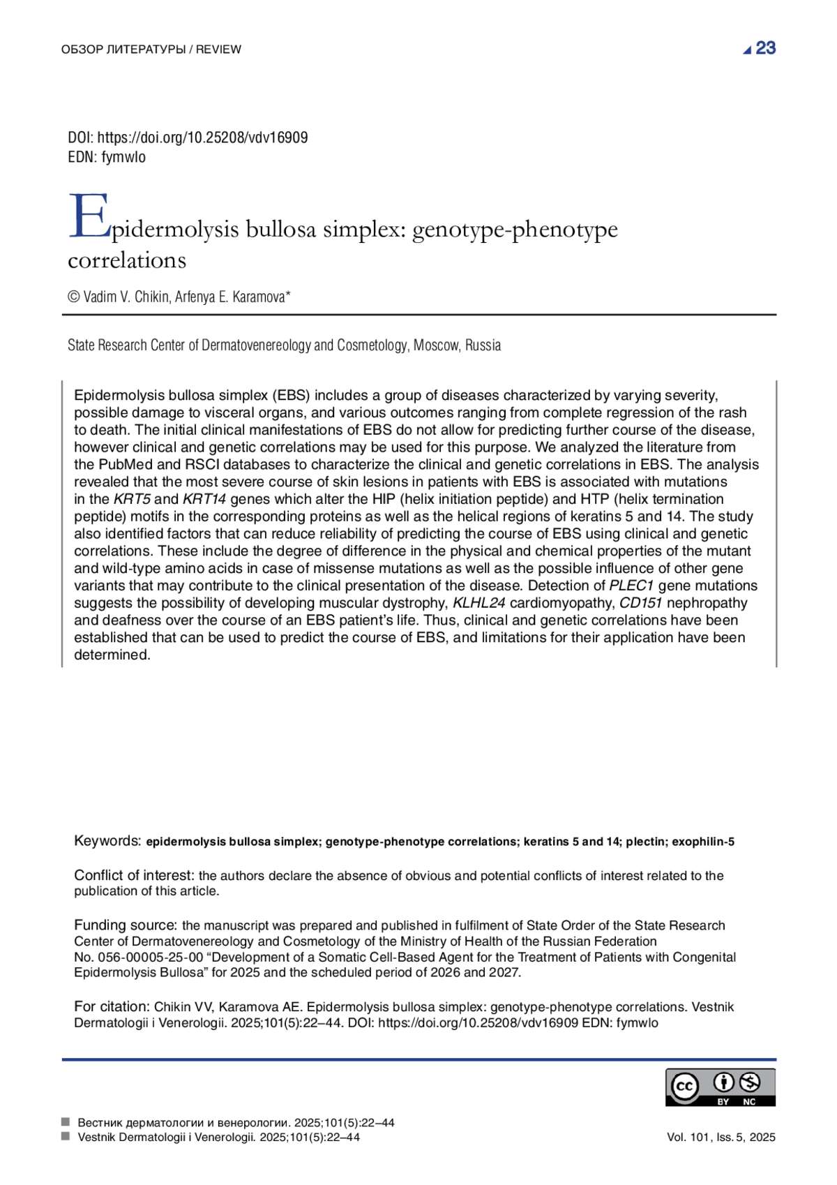 Простой врожденный буллезный эпидермолиз (ВБЭ) включает в себя группу заболеваний, характеризующихся различной тяжестью течения, возможным поражением внутренних органов и различными исходами — от полного регресса высыпаний до смерти больного. Первоначальные клинические проявления простого ВБЭ не позволяют прогнозировать дальнейшее течение болезни, однако для этого могут быть использованы клинико-генетические корреляции. Проведен анализ литературы из баз данных PubMed и РИНЦ с целью характеристики клинико-генетических корреляций при простом ВБЭ. В результате проведенного анализа установлено, что наиболее тяжелое течение поражения кожи у больных простым ВБЭ ассоциируется с мутациями генов KRT5 и KRT14, изменяющими в соответствующих белках мотивы HIP (пептид инициации спирали) и HTP (пептид завершения спирали), а также спиральные участки кератинов 5 и 14. Отмечены также факторы, способные снижать надежность прогнозирования течения простого ВБЭ с использованием клинико-генетических корреляций. К ним относятся степень различий физико-химических свойств мутантной аминокислоты и аминокислоты дикого типа в случае миссенс-мутаций, а также возможное влияние вариантов других генов, способных участвовать в формировании клинической картины болезни. Выявление мутаций гена PLEC1 указывает на возможность развития с течением жизни у больного простым ВБЭ мышечной дистрофии, KLHL24 — кардиомиопатии, CD151 — нефропатии и глухоты. Таким образом, установлены клинико-генетические корреляции, которые могут быть использованы для прогнозирования течения простого ВБЭ, а также определены ограничения для их применения.
