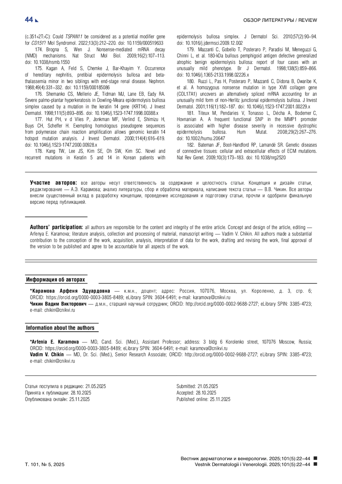 164. Kotalevskaya YY, Stepanov VA. Syndromic epidermolysis bullosa simplex subtype due to mutations in the KLHL24 gene: series of case reports in Russian families. Front Med (Lausanne). 2024;11:1418239. DOI: 10.3389/fmed.2024.1418239
