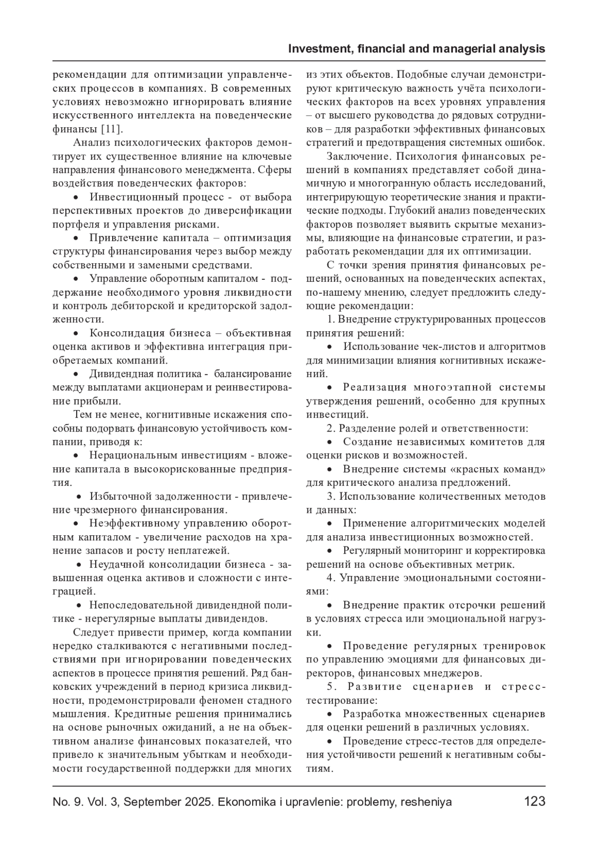 Статья посвящена исследованию влияния психологических аспектов на процесс принятия финансовых решений в компаниях. Авторы анализируют ключевые поведенческие факторы, включая когнитивные искажения, эмоциональные состояния, социальное окружение, которые существенно воздействуют на формирование финансовых стратегий. Особое внимание уделяется следующим феноменам: эффект чрезмерной уверенности, избегание потерь, эффект привязки, влияние эмоций. Авторы указывают, как эти факторы проявляются в различных сферах финансового менеджмента. В заключении предлагаются практические рекомендации по минимизации негативного влияния поведенческих искажений на принятие финансовых решений.