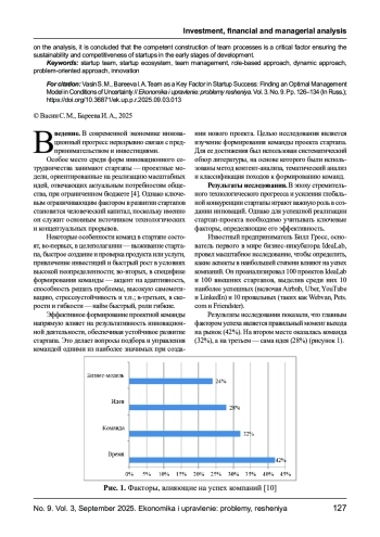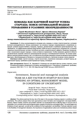В статье рассматривается ключевая роль команды в успехе стартап - проектов в условиях высокой неопределённости. Авторы анализируют три основных подхода к формированию и управлению командой: ролевой (модели Белбина, Базарова, Адизеса), динамический и проблемно - ориентированный. Подчёркивается, что эффективная команда представляет собой не просто совокупность специалистов, а сложную социально- психологическую систему, способную достигать синергетического эффекта. Выявлены преимущества и ограничения каждого подхода, а также условия их применения. Особое внимание уделяется гибкости управленческих решений, важности организационной культуры и мотивационной политики. На основе проведённого анализа делается вывод о том, что грамотное построение командных процессов является критическим фактором, обеспечивающим устойчивость и конкурентоспособность стартапов на ранних этапах развития.