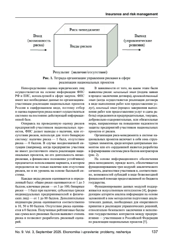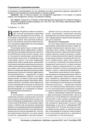 Настоящая статья посвящена разработке эффективной модели организации управления рисками национальных проектов. Рассматриваются ключевые аспекты скоринговой оценки уровня риска организаций - участников национальных проектов; использования аналитических возможностей искусственного интеллекта; создания эффективного инструментария риск - менеджмента и подготовки кадров его умелого применения. Особое внимание уделяется авторской модели организации управления рисками в сфере реализации национальных проектов, построенной в виде тетрады, снижающей риски. Исследование включает выявление рисков, формирование системы их оценки, анализ причин проявления, выстраивание риск - стратегии и определение путей нейтрализации воздействия рисков на выполнение контрактов предприятиями - участниками национальных проектов. Практическая значимость исследования заключается в возможности разработки рекомендаций для налоговых органов, других государственных структур, контролирующих работу предприятий - участников национальных проектов.