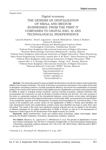 В статье рассматриваются вопросы цифровой трансформации субъектов малого и среднего предпринимательства (МСП) в Российской Федерации. Исследование данной проблематики приобретает особую значимость в контексте необходимости укрепления конкурентных позиций, повышения операционной эффективности и обеспечения устойчивости хозяйствующих субъектов в условиях стремительной эволюции цифровой экономики. Процессы цифровизации создают для МСП возможности адаптации к изменяющимся рыночным условиям, совершенствования бизнес - процессов, оптимизации взаимодействия с контрагентами и потребителями, а также разработки инновационных продуктов и сервисов.
