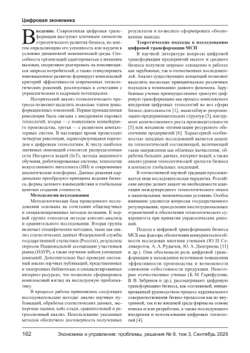 Основной целью проведенного исследования выступает системный анализ характерных особенностей, актуальных тенденций, современного состояния, используемых технологических решений, моделей и инструментария цифровой трансформации российского МСП, сопровождающийся выявлением ключевых проблемных аспектов и разработкой практических рекомендаций по их преодолению. В ходе аналитической работы были определены приоритетные векторы цифровизации МСП в России, систематизированы основные тенденции развития, идентифицированы проблемные зоны и сформулированы пути их решения.
