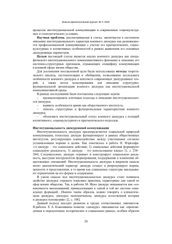 19. Корниевская, Т. К. Структурно-стилистические характеристики англоязычного военного дискурса / Т. К. Корниевская. - Текст: непосредственный // Современная наука: актуальные проблемы теории и практики. - Серия: Гуманитарные науки. - 2020. - № 7-2. - C. 139-141. EDN: SOTSWR