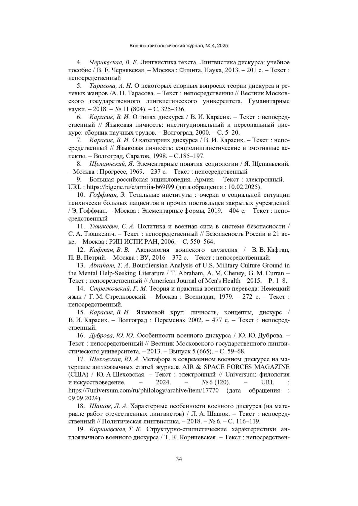 18. Шашок, Л. А. Характерные особенности военного дискурса (на материале работ отечественных лингвистов) / Л. А. Шашок. - Текст: непосредственный // Политическая лингвистика. - 2018. - № 6. - C. 116-119. EDN: YSWQAX