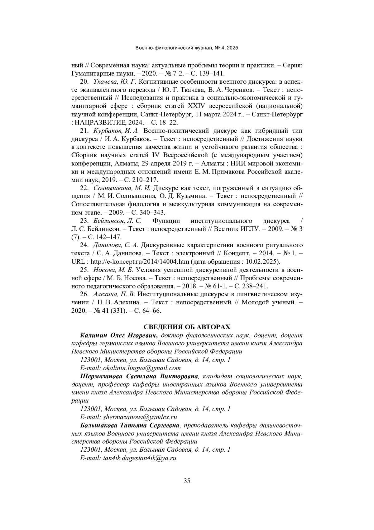 20. Ткачева, Ю. Г. Когнитивные особенности военного дискурса: в аспекте эквивалентного перевода / Ю. Г. Ткачева, В. А. Черенков. - Текст: непосредственный // Исследования и практика в социально-экономической и гуманитарной сфере: сборник статей XXIV всероссийской (национальной) научной конференции, Санкт-Петербург, 11 марта 2024 г. - Санкт-Петербург: НАЦРАЗВИТИЕ, 2024. - C. 18-22. EDN: XRCSLQ