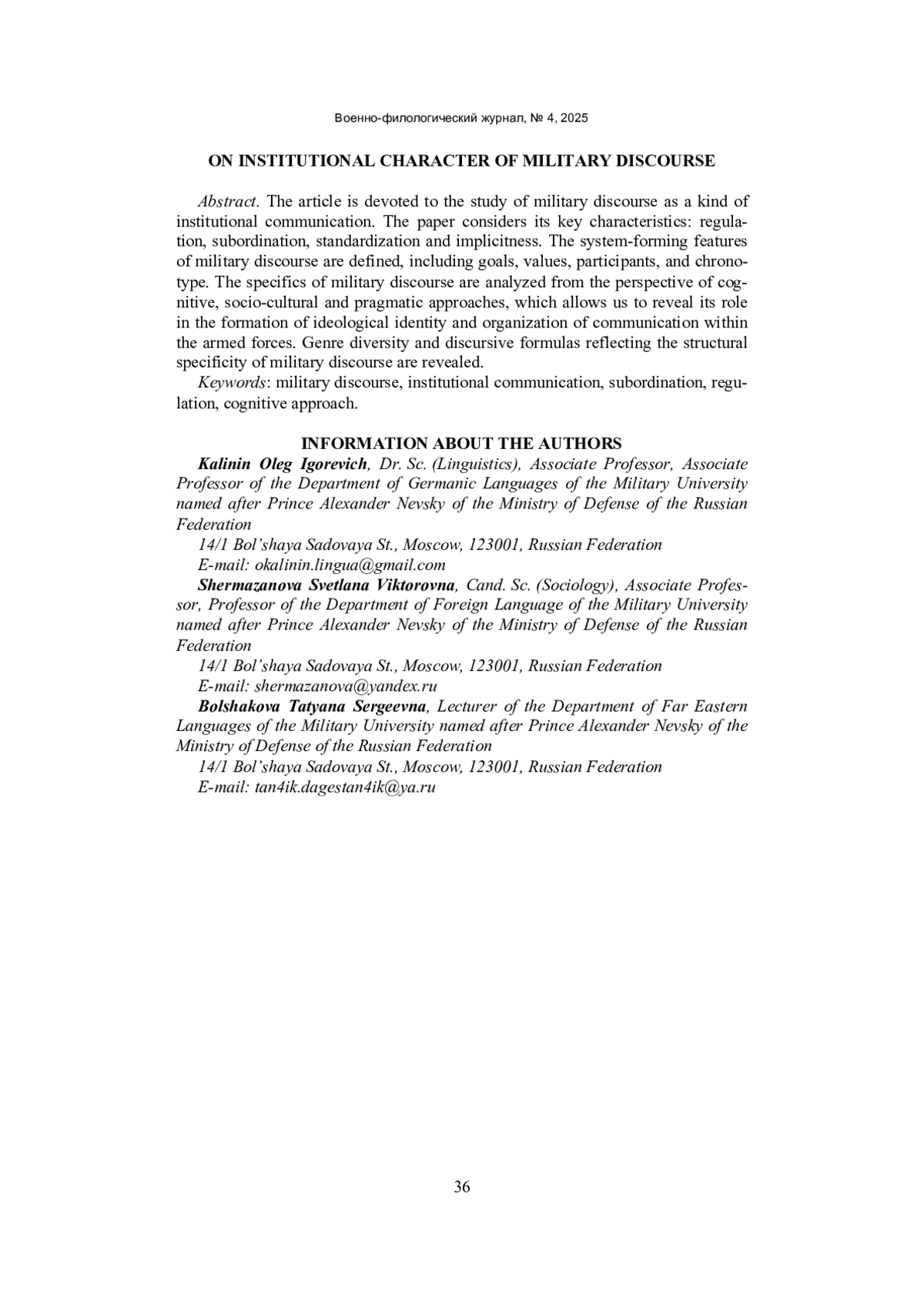 Статья посвящена исследованию военного дискурса как разновидности институциональной коммуникации. В работе рассматриваются его ключевые характеристики: регламентированность, субординация, стандартизированность и имплицитность. Определяются системообразующие признаки военного дискурса, включая цели, ценности, участников, хронотоп. Анализируется специфика военного дискурса с позиций когнитивного, социокультурного и прагматического подходов, что позволяет раскрыть его роль в формировании идеологической идентичности и организации коммуникации внутри вооруженных сил. Выявлены жанровое разнообразие и дискурсивные формулы, отражающие структурную специфику военного дискурса.