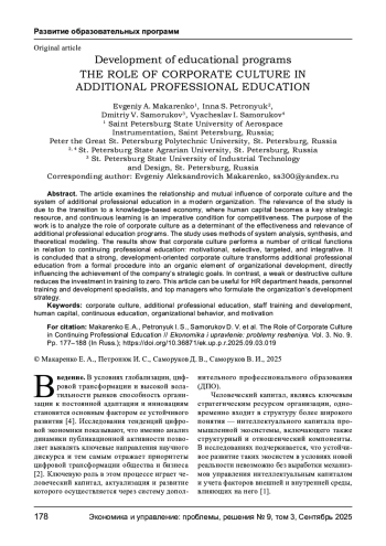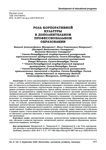 Целью работы является анализ роли корпоративной культуры как детерминанты эффективности и востребованности программ дополнительного профессионального образования. В исследовании применяются методы системного анализа, синтеза и теоретического моделирования.