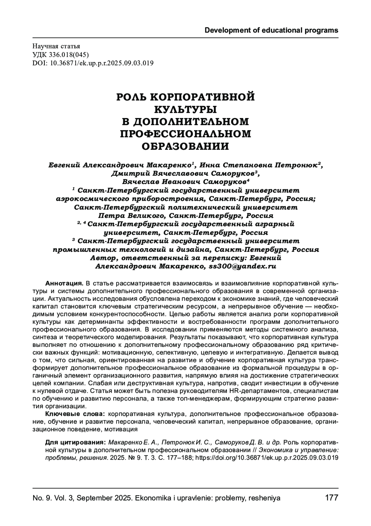 Результаты показывают, что корпоративная культура выполняет по отношению к дополнительному профессиональному образованию ряд критически важных функций: мотивационную, селективную, целевую и интегративную. Делается вывод о том, что сильная, ориентированная на развитие и обучение корпоративная культура трансформирует дополнительное профессиональное образование из формальной процедуры в органичный элемент организационного развития, напрямую влияя на достижение стратегических целей компании. Слабая или деструктивная культура, напротив, сводит инвестиции в обучение к нулевой отдаче. Статья может быть полезна руководителям HR-департаментов, специалистам по обучению и развитию персонала, а также топ-менеджерам, формирующим стратегию развития организации.
