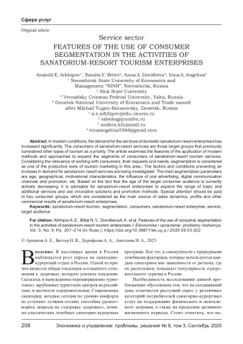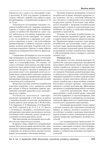 В современных условиях значительно вырос спрос на услуги отечественных санаторно - курортных предприятий. Потребителями санаторно - курортных услуг становятся те целевые группы, которые раньше рассматривали в качестве приоритетных другие виды туризма. В статье рассматриваются особенности применения современных методов и подходов для расширения сегментов потребителей санаторно - курортных услуг. Учитывая актуальность работы с потребителями, их запросами и нуждами, сегментация рассматривается как один из продуктивных инструментов туристского маркетинга в этой сфере; исследуются факторы и условия, препятствующие увеличению потребительского спроса на санаторно - курортные услуги. В качестве основных параметров сегментации выделены возрастные, географические, мотивационные характеристики, влияние устной рекламы, цифровых каналов коммуникаций и продвижения и др. Исходя из того, что в настоящее время активно снижается возраст целевой потребительской аудитории, санаторно - курортным предприятиям целесообразно расширять спектр основных и дополнительных услуг, использовать инновационные решения и методы продвижения. Особое внимание следует уделять ключевым потребительским группам, которые рассматриваются в качестве основного драйвера продаж, прибыли и других коммерческих результатах санаторно - курортных предприятий.