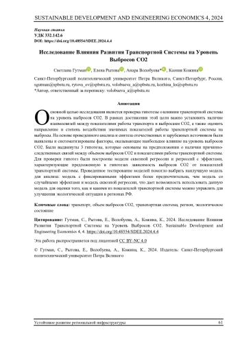 The main objective of this study is to examine the influence of the transport system on CO2 emission levels. To achieve this goal, first, identify existing interrelationships between transport performance indicators and CO2 emissions was established, and the direction and degree of impact of significant performance indicators of the transport system on emissions were assessed. Next, based on analysis and synthesis of the literature - both domestic and foreign - factors that have the greatest influence on the level of CO2 emissions were identified and systematized. Assuming that there are causal relationships between the amount of CO2 emissions and the performance of the transport system, three hypotheses were put forward. To test the hypotheses, two models - end-to-end regression and regressions with effects - were considered to characterize the dependence of CO2 emissions on transport system performance. Model testing was conducted to choose the best model for analysis. It was found that the fixed-effects regression model is preferable to the random-effects and end-to-end regression models with regard to identifying and assessing the transport system indicators that can be managed to improve environmental conditions in various regions of the Russian Federation.