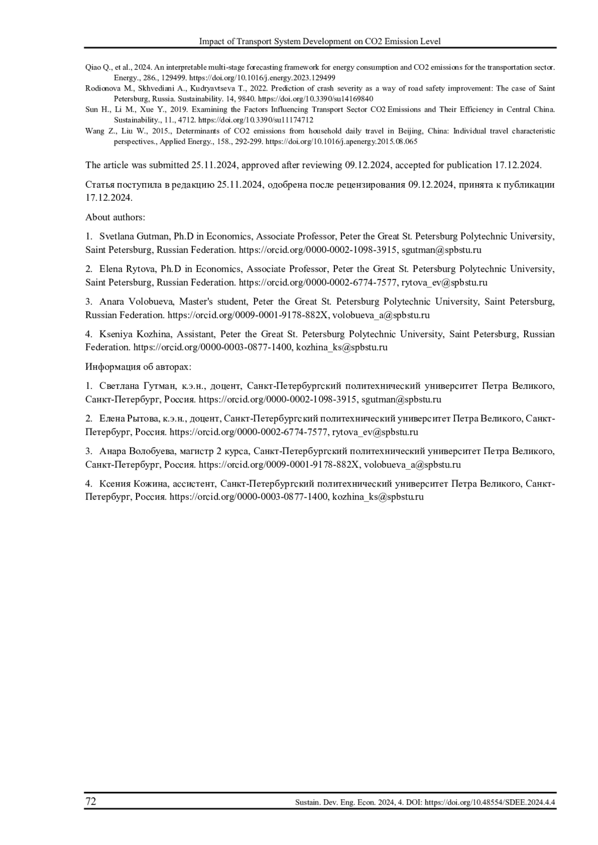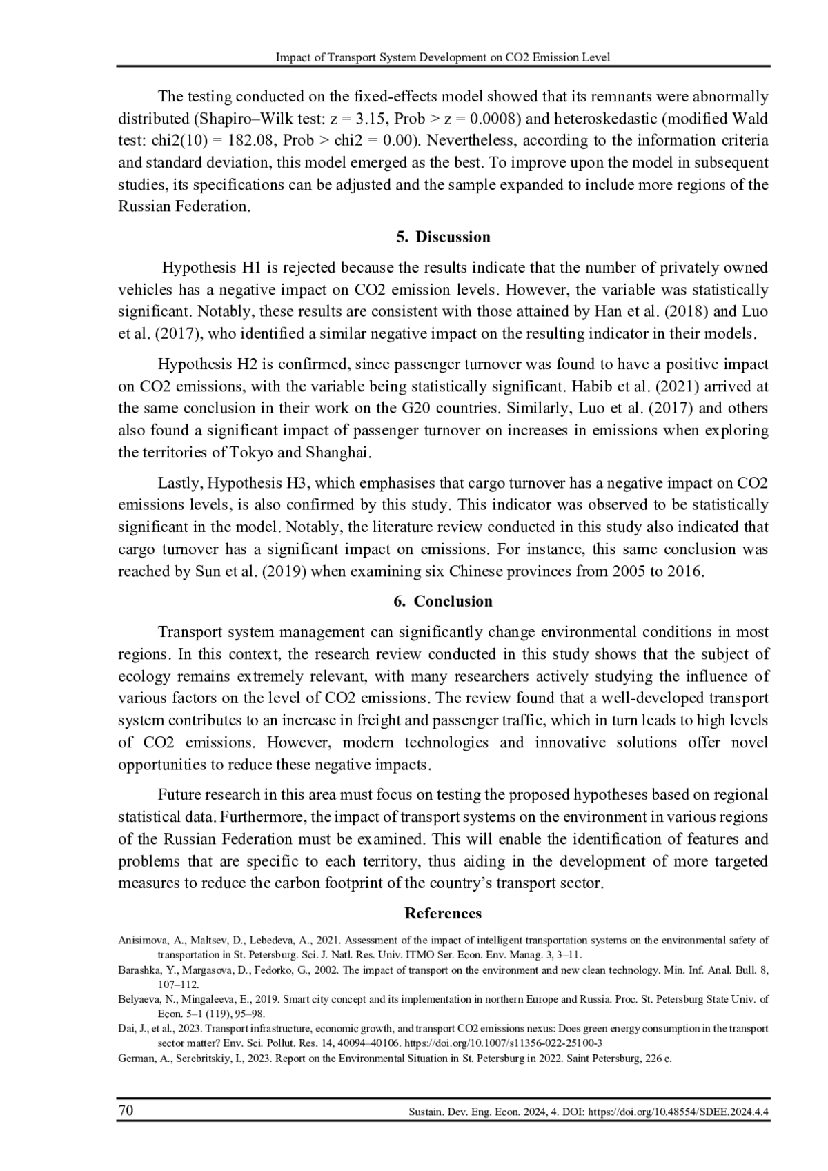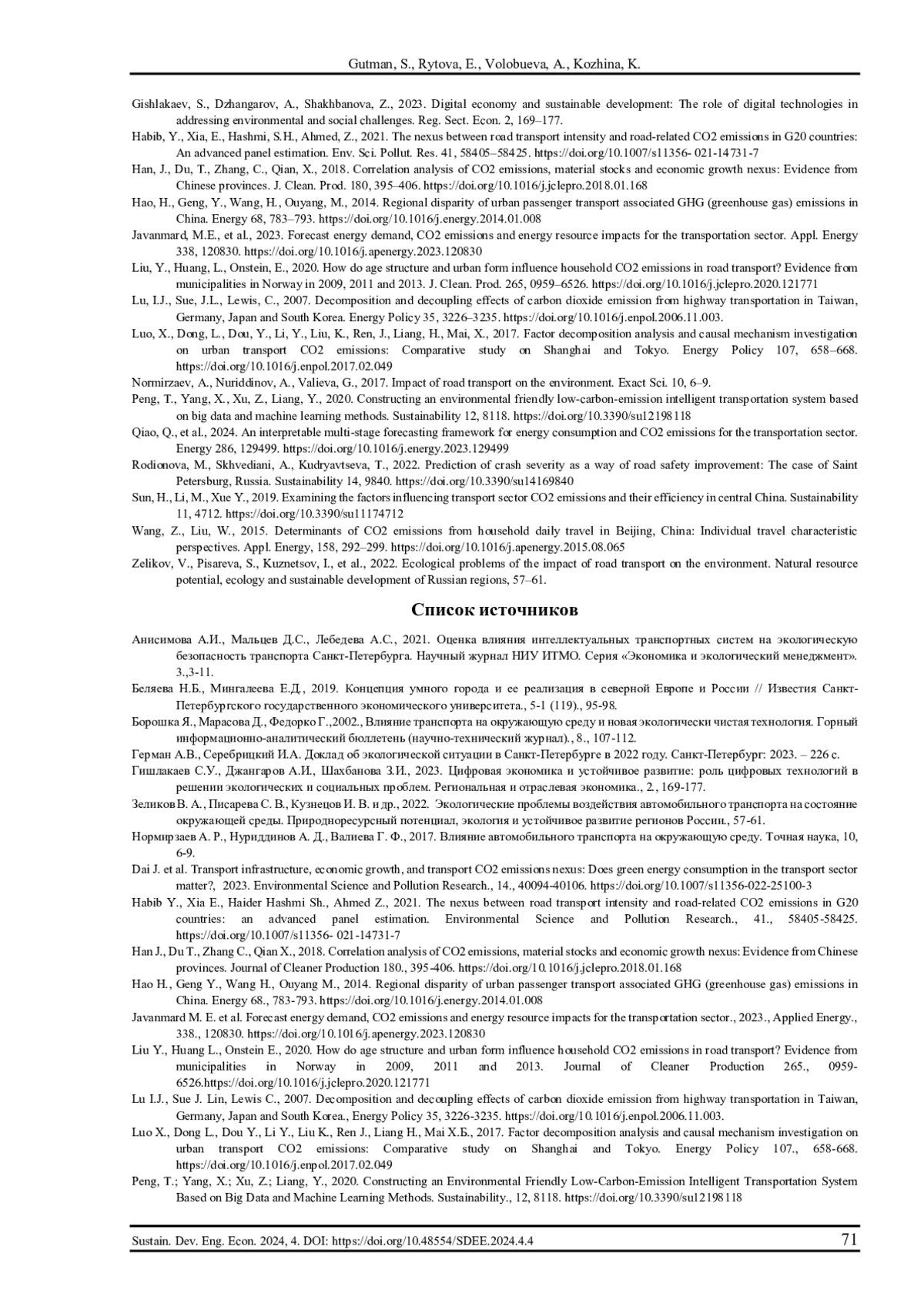 1. Анисимова А.И., Мальцев Д.С., Лебедева А.С., 2021. Оценка влияния интеллектуальных транспортных систем на экологическую безопасность транспорта Санкт-Петербурга. Научный журнал НИУ ИТМО. Серия “Экономика и экологический менеджмент”. 3.,3-11.