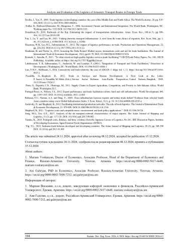 8. Devlin, J., Yee, P., 2005. Trade logistics in developing countries: the case of the Middle East and North Africa. The World Economy, 28, pp. 435-456,. DOI: 10.1111/j.1467-9701.2005.00620.x