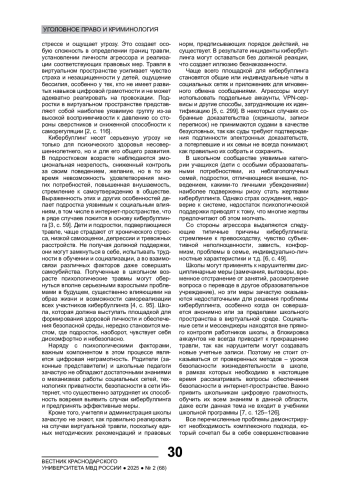 7. Исмаилов Г.М., Невиницына В.С., Ломовская С.А., Ноткина В.О., Скорнякова Л.В. Влияние кибербуллинга на человека в современном мире // Вопросы развития современной науки и техники. 2020. №1. С. 122-129. EDN: KDLJXL