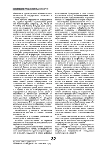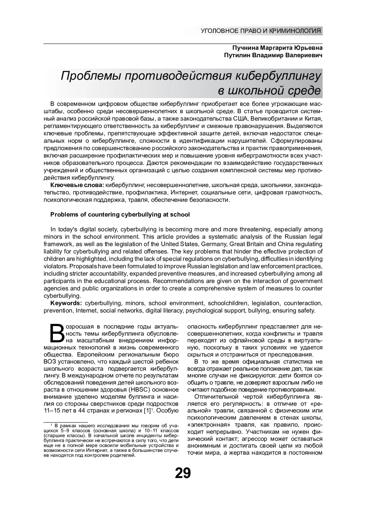 В современном цифровом обществе кибербуллинг приобретает все более угрожающие масштабы, особенно среди несовершеннолетних в школьной среде. В статье проводится системный анализ российской правовой базы, а также законодательства США, Великобритании и Китая, регламентирующего ответственность за кибербуллинг и смежные правонарушения. Выделяются ключевые проблемы, препятствующие эффективной защите детей, включая недостаток специальных норм о кибербуллинге, сложности в идентификации нарушителей. Сформулированы предложения по совершенствованию российского законодательства и практик правоприменения, включая расширение профилактических мер и повышение уровня киберграмотности всех участников образовательного процесса. Даются рекомендации по взаимодействию государственных учреждений и общественных организаций с целью создания комплексной системы мер противодействия кибербуллингу