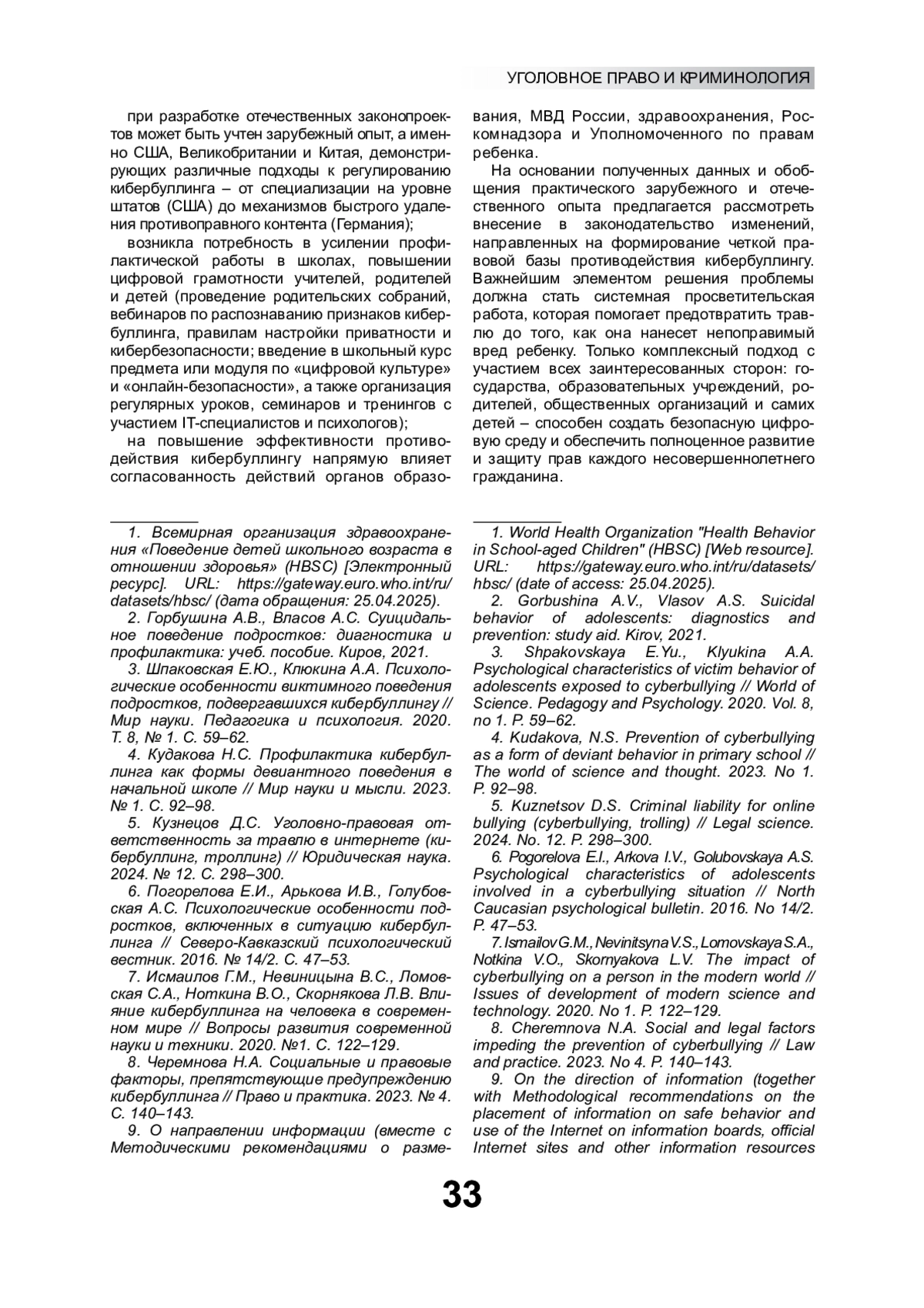 8. Черемнова Н.А. Социальные и правовые факторы, препятствующие предупреждению кибербуллинга // Право и практика. 2023. № 4. С. 140-143. EDN: KMFGAV