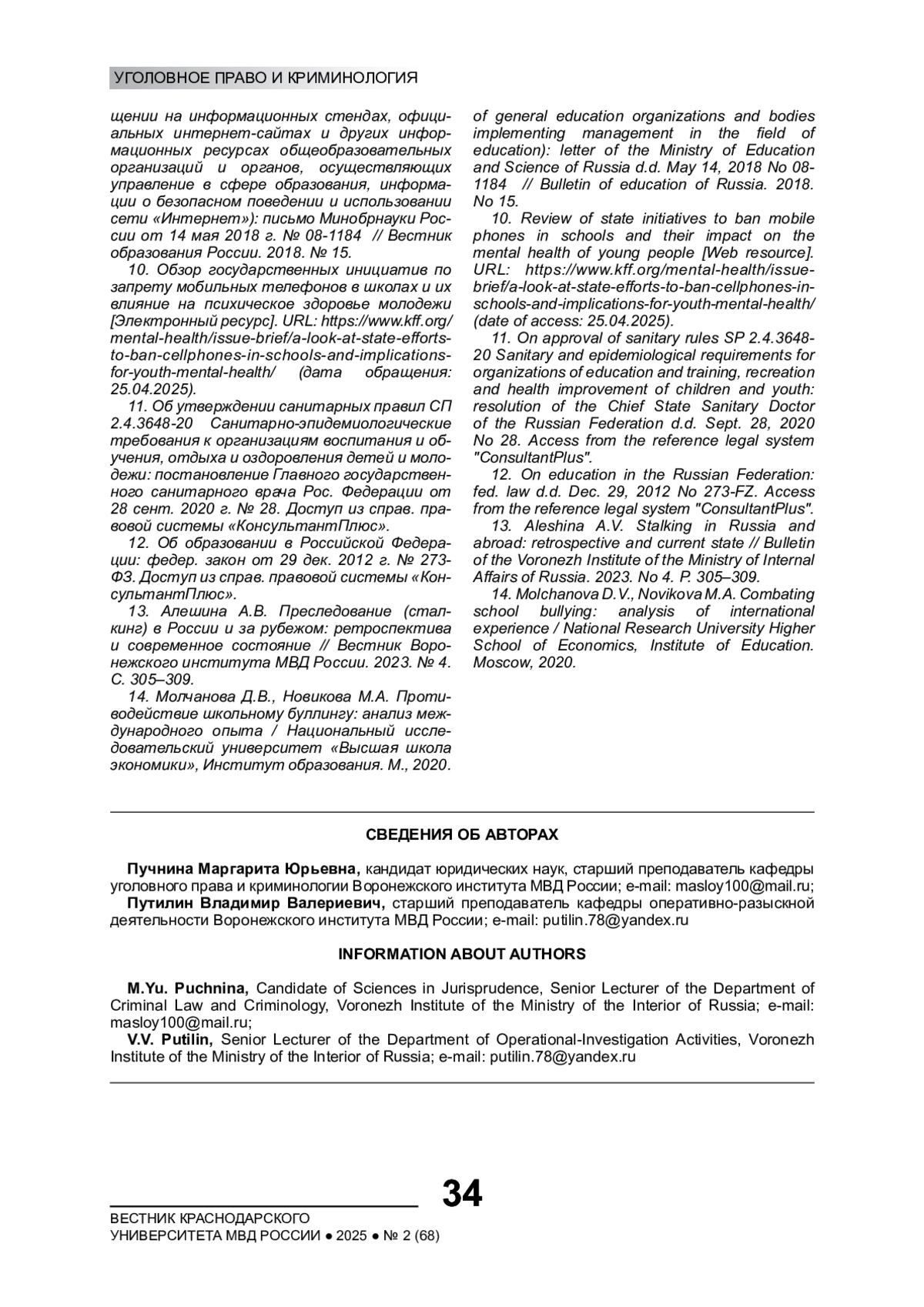 13. Алешина А.В. Преследование (сталкинг) в России и за рубежом: ретроспектива и современное состояние // Вестник Воронежского института МВД России. 2023. № 4. С. 305-309. EDN: DLOTGK