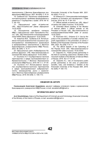22. Осипенко А.Л. Использование принципов государственно-частного партнерства в сфере противодействия киберпреступности: преимущества, риски и ограничения // Вестник Краснодарского университета МВД России. 2019. № 4(46). C. 105-113. EDN: LTCWNB