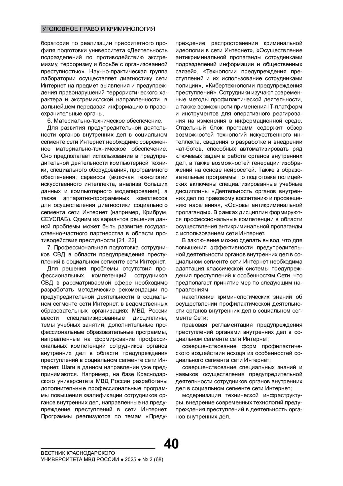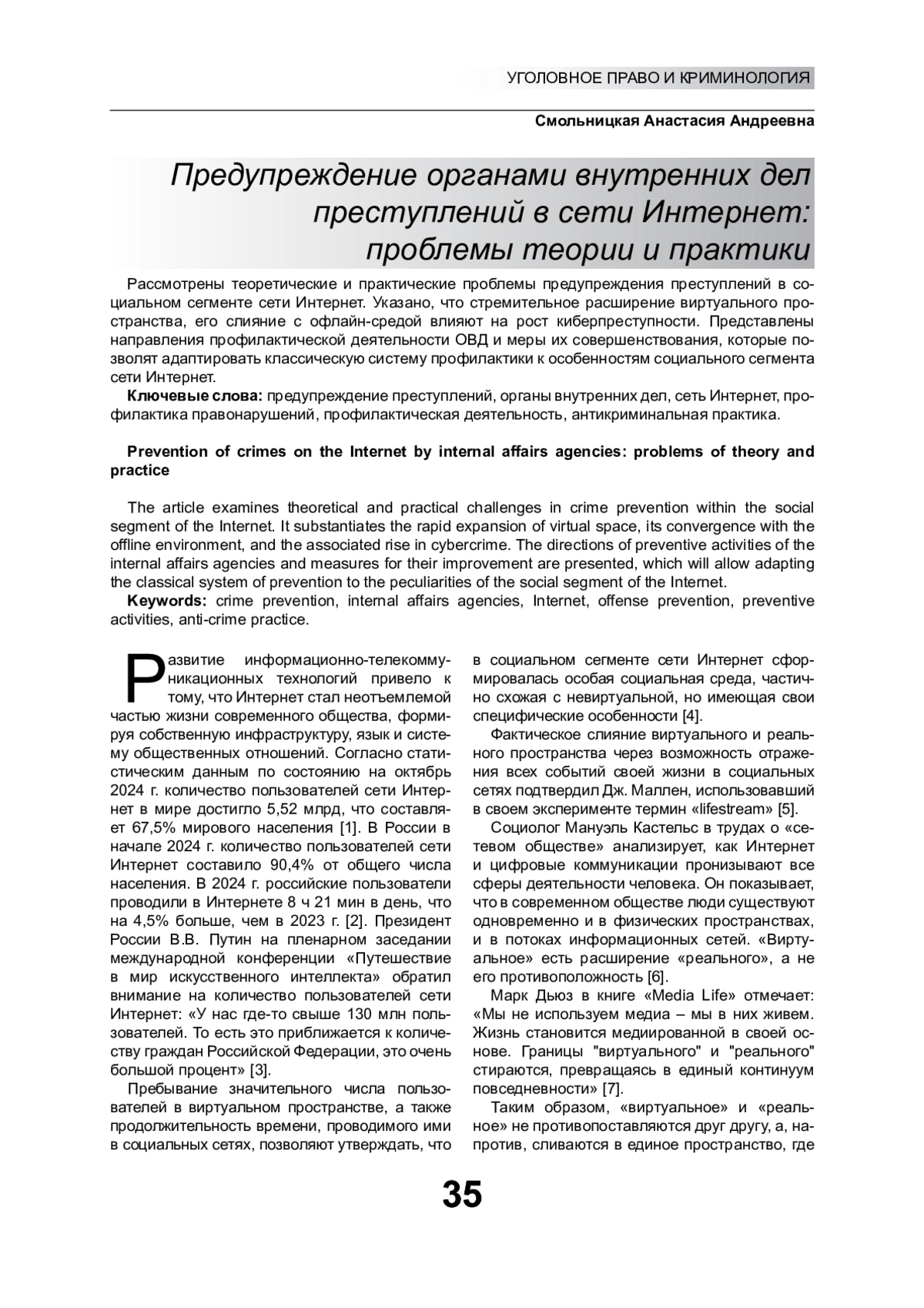 Рассмотрены теоретические и практические проблемы предупреждения преступлений в социальном сегменте сети Интернет. Указано, что стремительное расширение виртуального пространства, его слияние с офлайн-средой влияют на рост киберпреступности. Представлены направления профилактической деятельности ОВД и меры их совершенствования, которые позволят адаптировать классическую систему профилактики к особенностям социального сегмента сети Интернет