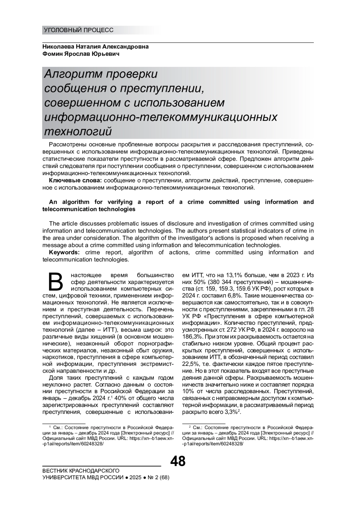 1. Костенко Н.С., Семененко Г.М., Пшеничкин А.А. Основные проблемы раскрытия и расследования преступлений, совершаемых с использованием информационно-телекоммуникационных технологий, на современном этапе // Вестник Воронежского института МВД России. 2020. № 4. С. 192-196. EDN: GTFJDV