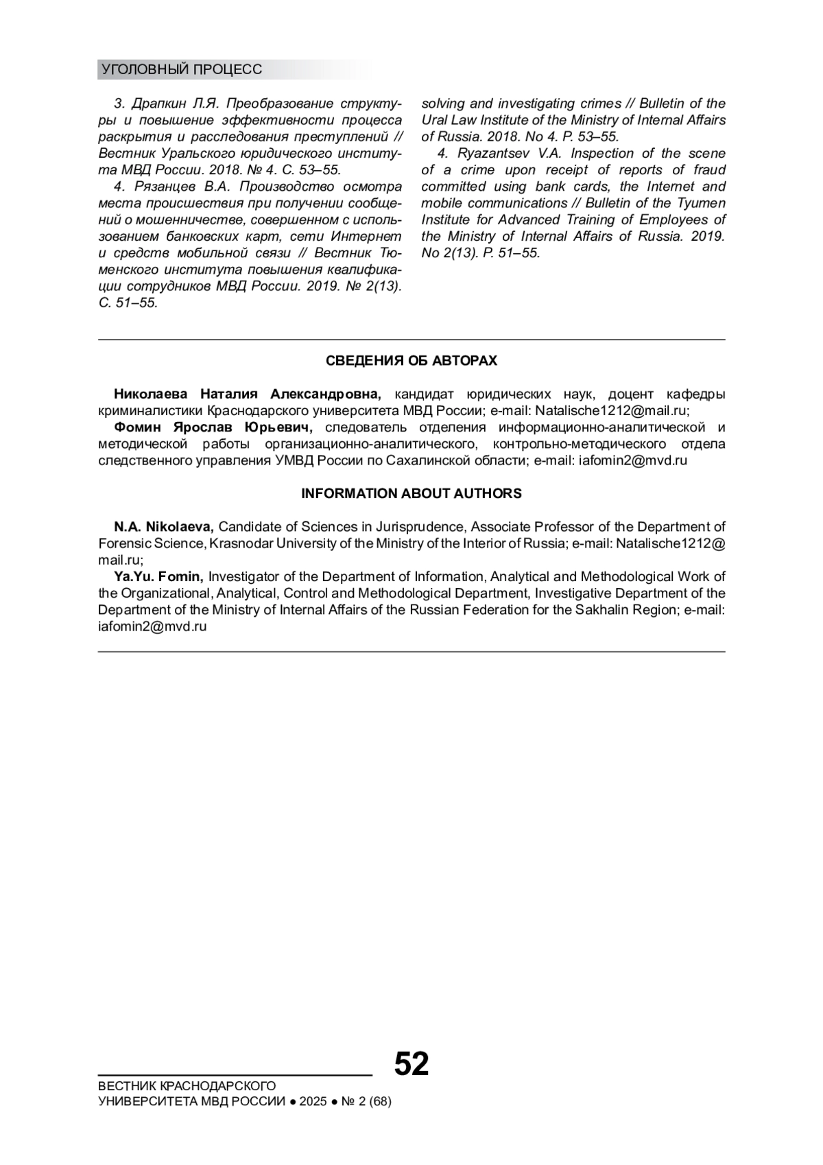 3. Драпкин Л.Я. Преобразование структуры и повышение эффективности процесса раскрытия и расследования преступлений // Вестник Уральского юридического института МВД России. 2018. № 4. С. 53-55. EDN: VPEZMC