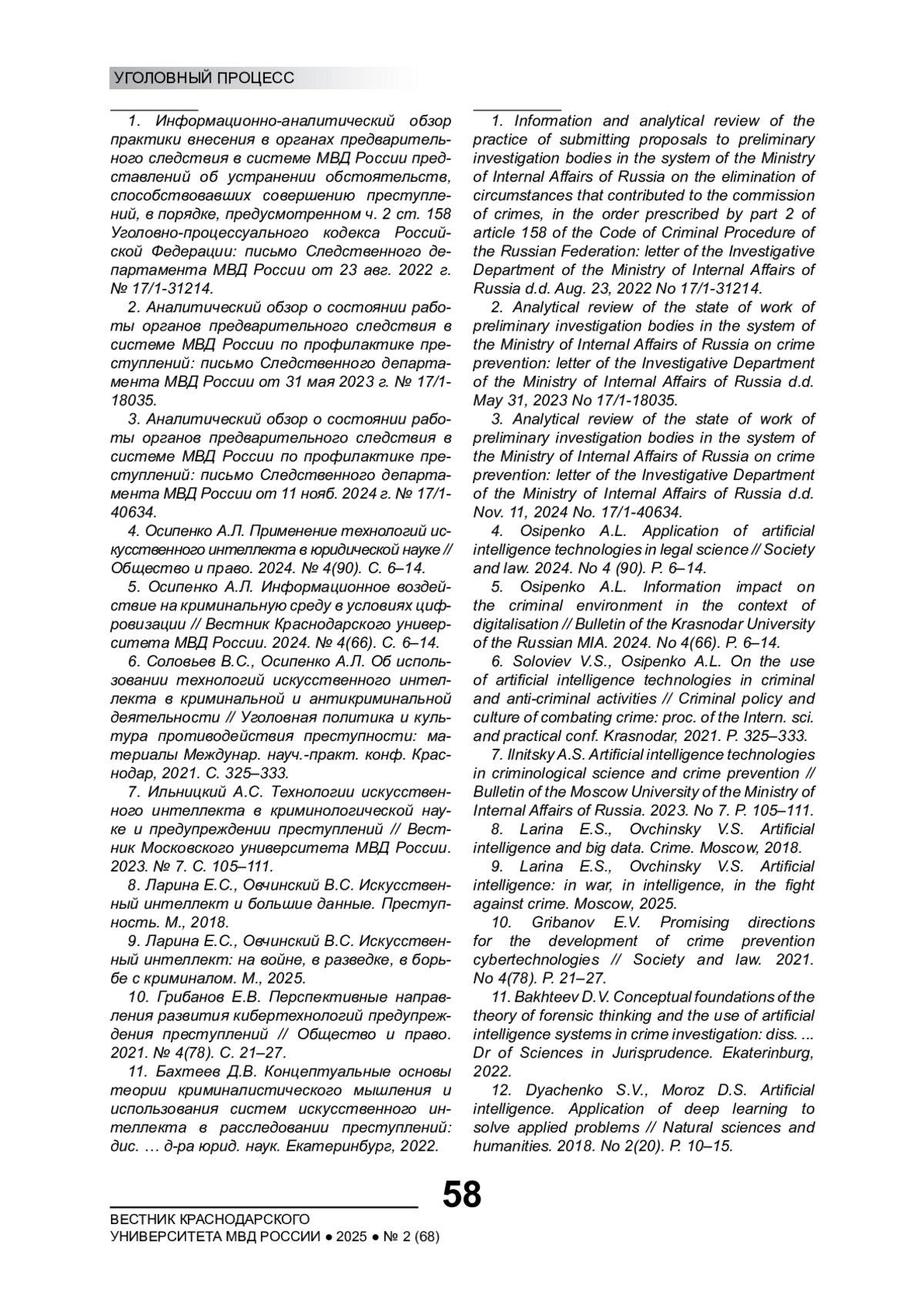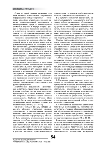 7. Ильницкий А.С. Технологии искусственного интеллекта в криминологической науке и предупреждении преступлений // Вестник Московского университета МВД России. 2023. № 7. С. 105-111.