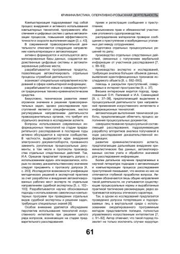Процесс развития любой области жизнедеятельности предполагает на одном из этапов решение задач, связанных с возможностями автоматизации как отдельных операций, выполняемых человеком, так и целых направлений. Не является исключением и правоохранительная деятельность, в том числе расследование преступлений. Рост транснациональной преступности, усложнение способов совершения преступлений, переход от традиционных форм их совершения к дистанционным, реализуемым посредством применения современных средств коммуникации, программных и технических решений, позволяющих скрывать истинную личность преступника и его местонахождение, существенно осложняют процесс расследования. Так, анализ судебно-следственной практики позволяет констатировать, что за последнее десятилетие существенно возросло число мошенничеств – с 7% от общего числа преступлений в 2014 г. до 23% в 2024 г. Порядка 40% преступлений в настоящее время совершаются в сфере информационно-телекоммуникационных технологий или компьютерной информации [1]. Это требует кардинально новых подходов в противодействии преступности со стороны правоохранительных органов.