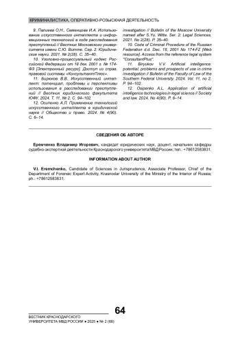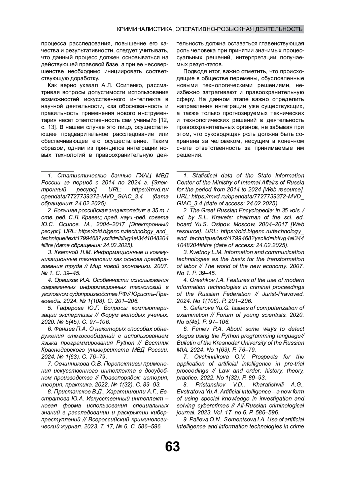 8. Пристансков В.Д., Харатишвили А.Г., Евстратова Ю.А. Искусственный интеллект - новая форма использования специальных знаний в расследовании и раскрытии киберпреступлений // Всероссийский криминологический журнал. 2023. Т. 17, № 6. С. 586-596. EDN: DPHKOC