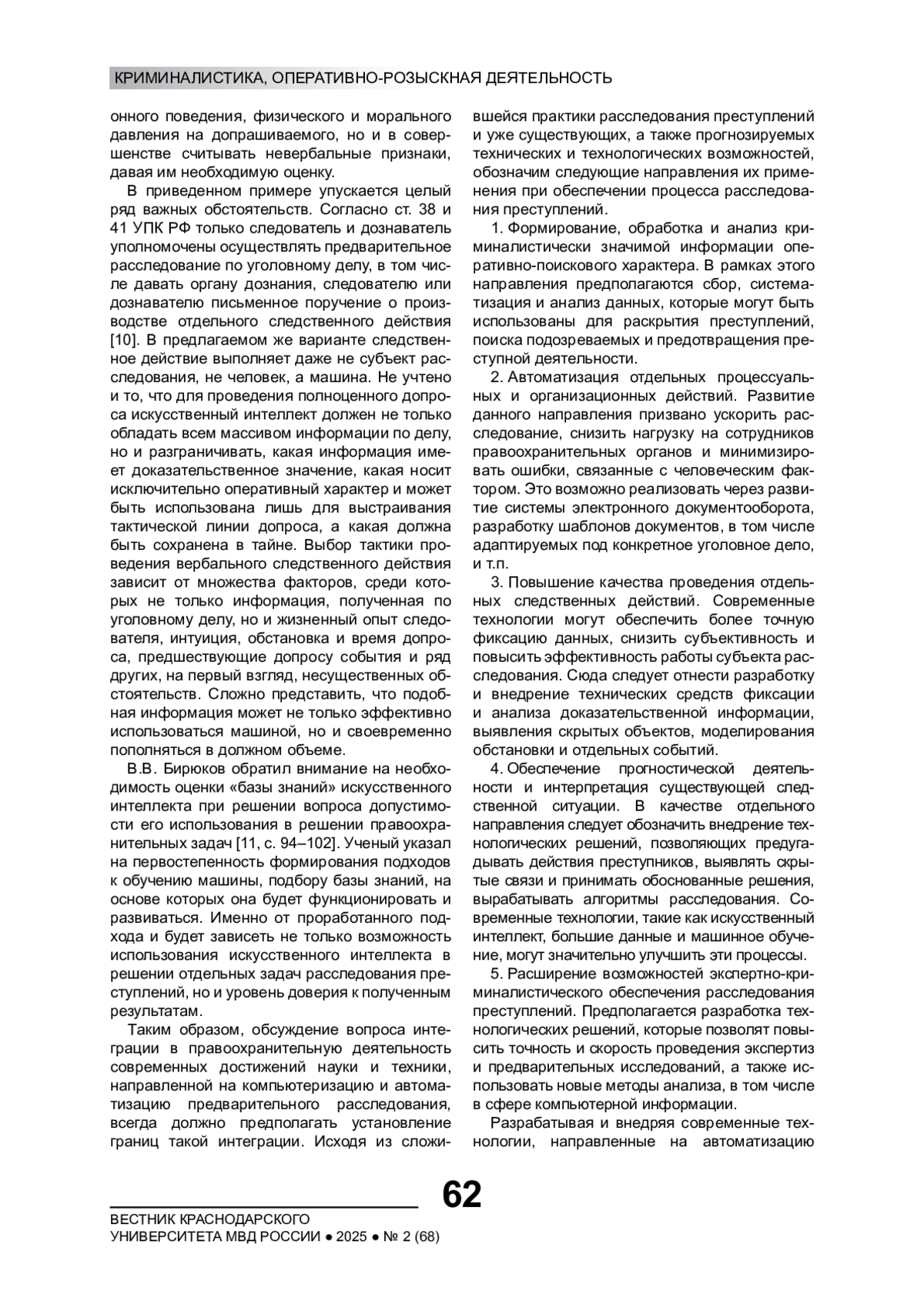 11. Бирюков В.В. Искусственный интеллект: потенциал, проблемы и перспективы использования в расследовании преступлений // Вестник юридического факультета ЮФУ. 2024. Т. 11, № 2. С. 94-102.
