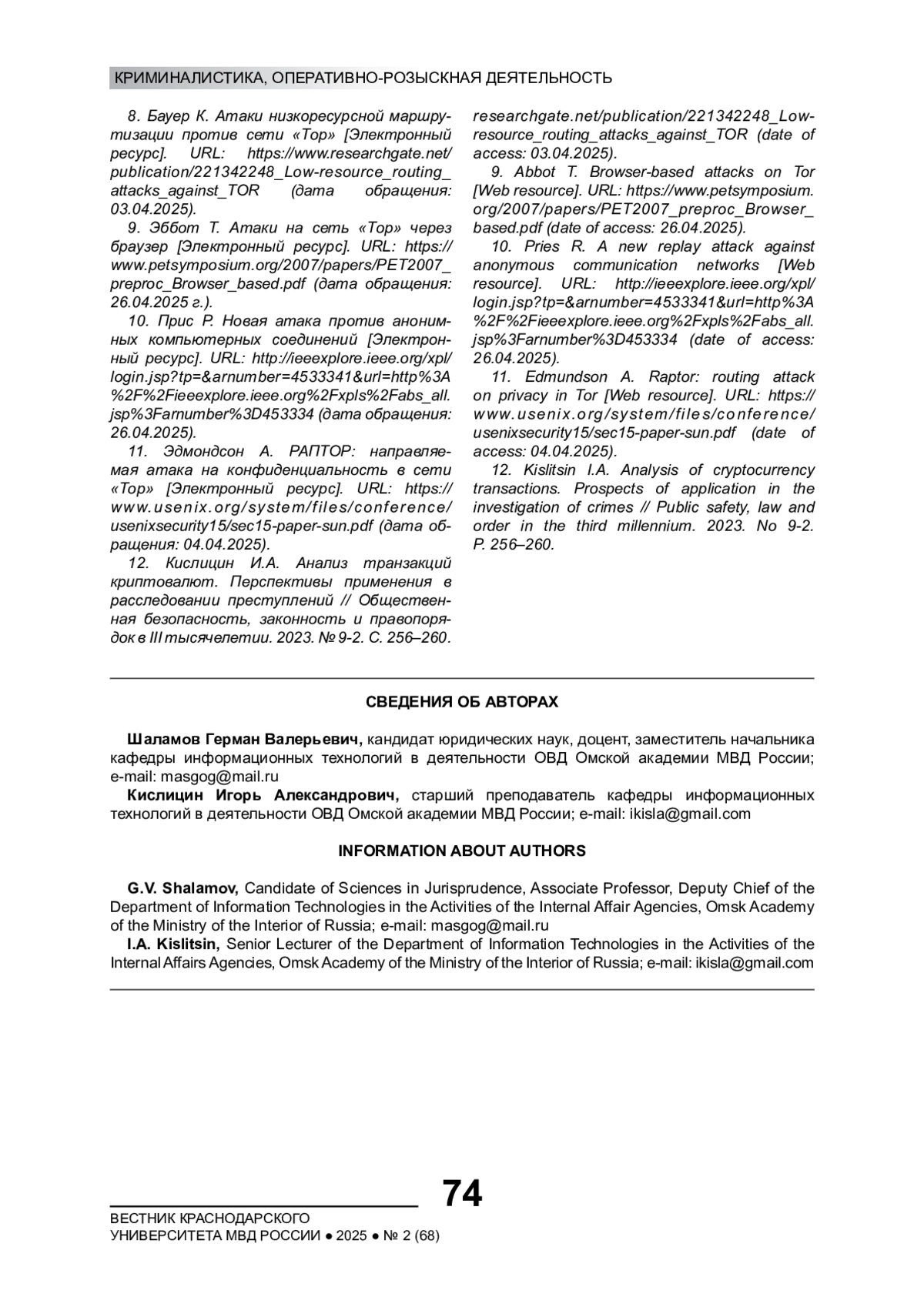 12. Кислицин И.А. Анализ транзакций криптовалют. Перспективы применения в расследовании преступлений // Общественная безопасность, законность и правопорядок в III тысячелетии. 2023. № 9-2. С. 256-260. EDN: DRTJOI
