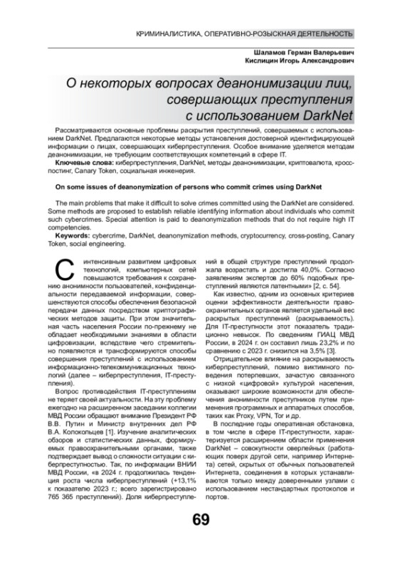 Рассматриваются основные проблемы раскрытия преступлений, совершаемых с использованием DarkNet. Предлагаются некоторые методы установления достоверной идентифицирующей информации о лицах, совершающих киберпреступления. Особое внимание уделяется методам деанонимизации, не требующим соответствующих компетенций в сфере IT