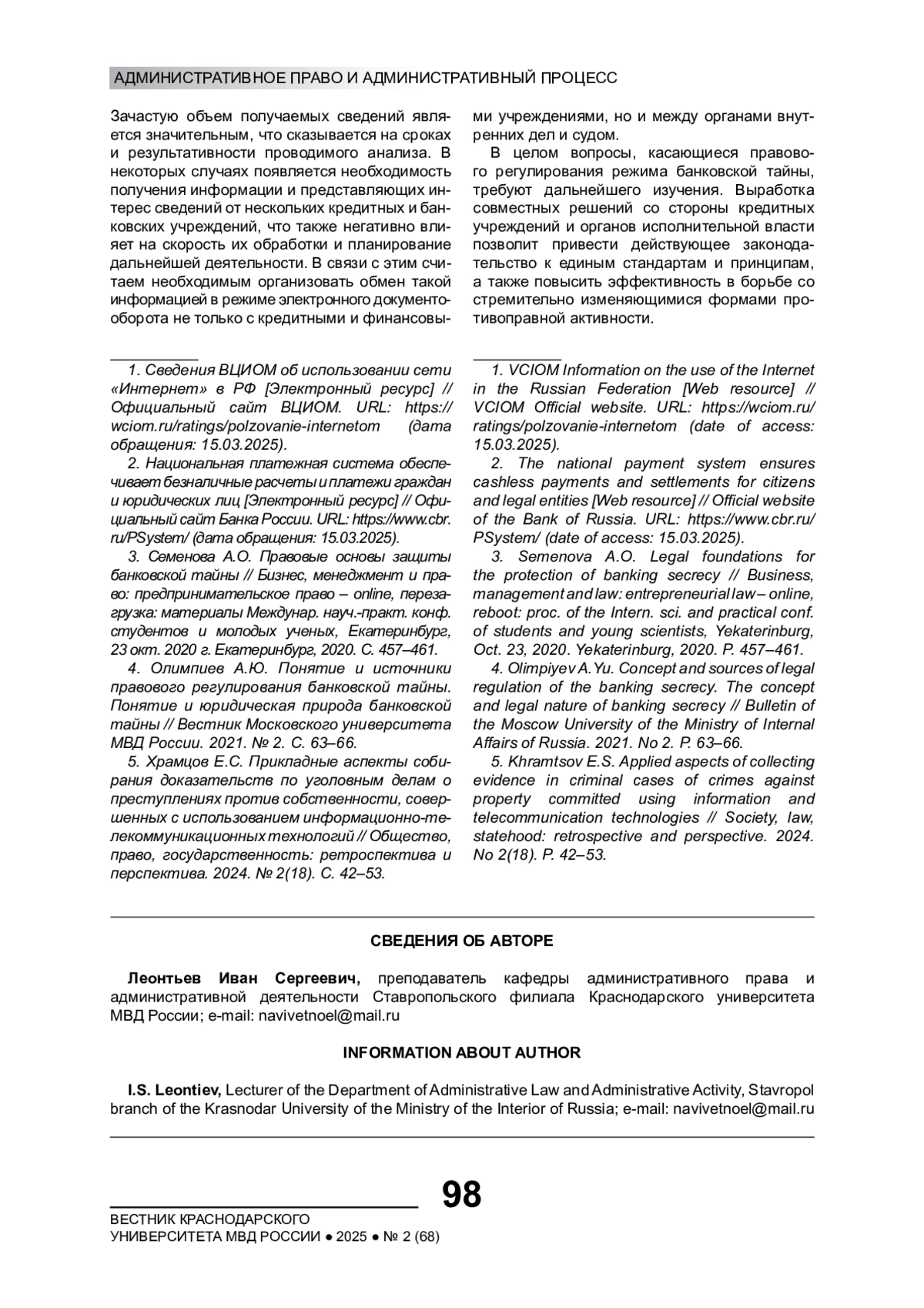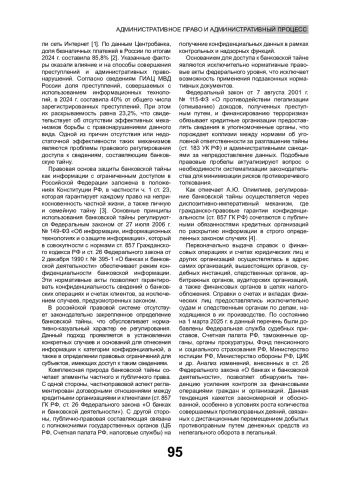 4. Олимпиев А.Ю. Понятие и источники правового регулирования банковской тайны. Понятие и юридическая природа банковской тайны // Вестник Московского университета МВД России. 2021. № 2. С. 63-66.