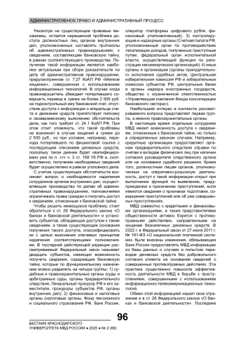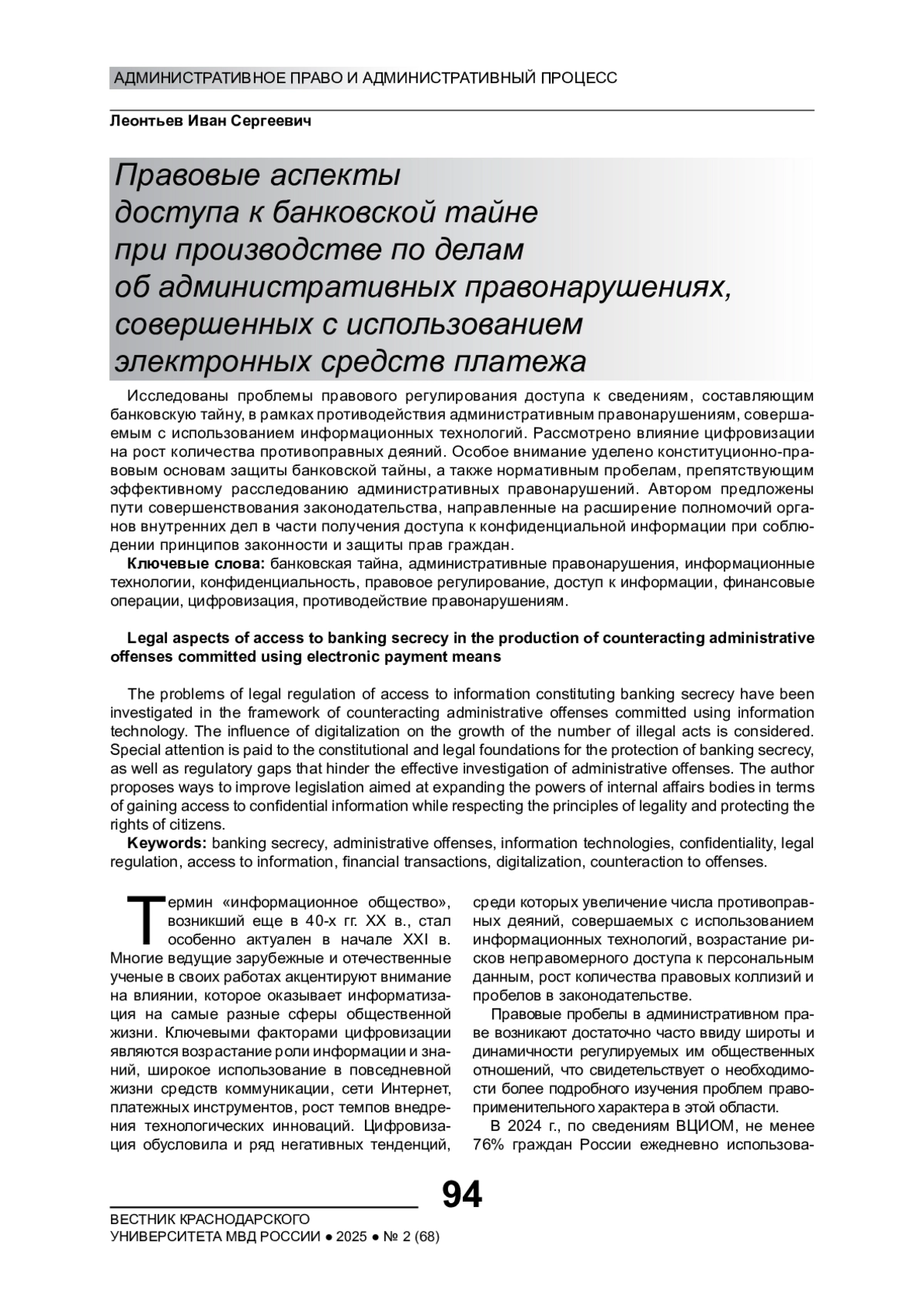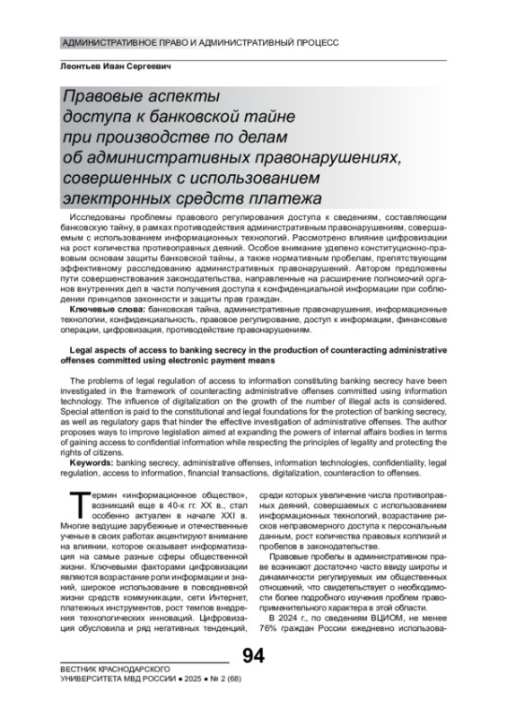 Исследованы проблемы правового регулирования доступа к сведениям, составляющим банковскую тайну, в рамках противодействия административным правонарушениям, совершаемым с использованием информационных технологий. Рассмотрено влияние цифровизации на рост количества противоправных деяний. Особое внимание уделено конституционно-правовым основам защиты банковской тайны, а также нормативным пробелам, препятствующим эффективному расследованию административных правонарушений. Автором предложены пути совершенствования законодательства, направленные на расширение полномочий органов внутренних дел в части получения доступа к конфиденциальной информации при соблюдении принципов законности и защиты прав граждан