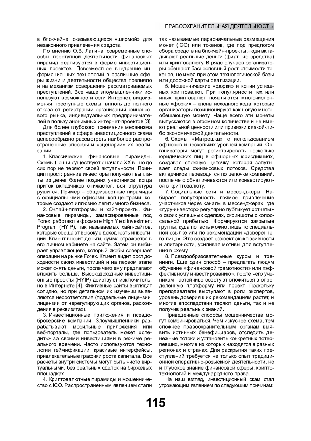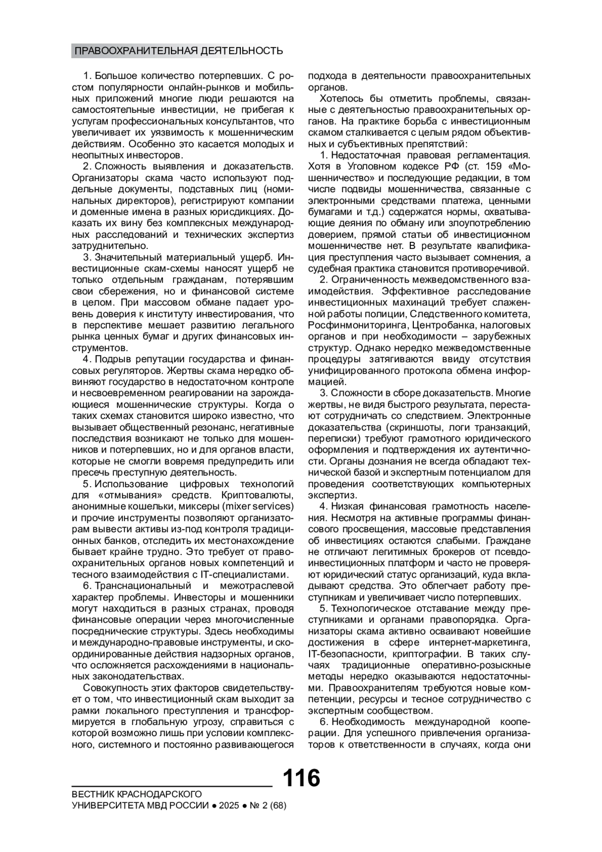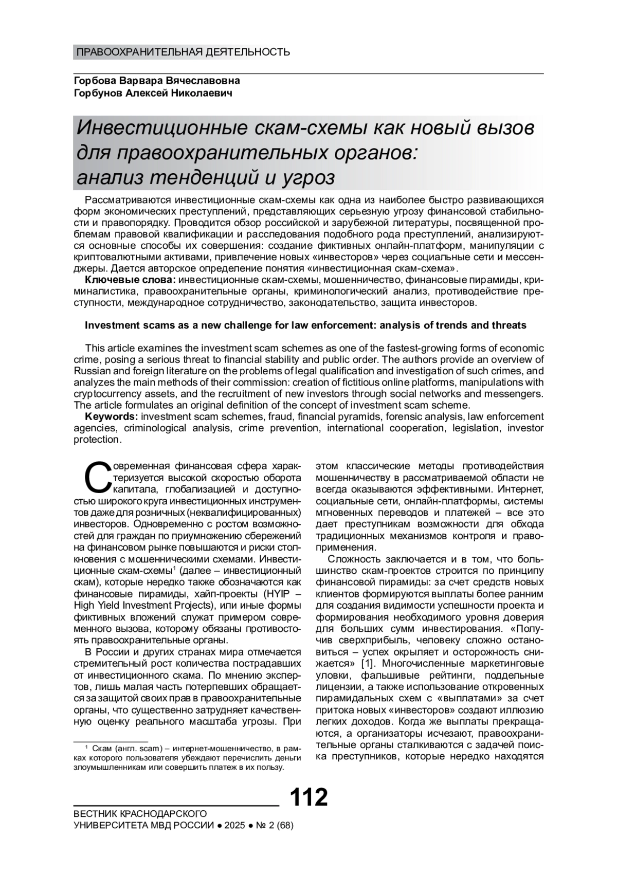 Современная финансовая сфера характеризуется высокой скоростью оборота капитала, глобализацией и доступностью широкого круга инвестиционных инструментов даже для розничных (неквалифицированных) инвесторов. Одновременно с ростом возможностей для граждан по приумножению сбережений на финансовом рынке повышаются и риски столкновения с мошенническими схемами. Инвестиционные скам-схемы1 (далее – инвестиционный скам), которые нередко также обозначаются как финансовые пирамиды, хайп-проекты (HYIP – High Yield Investment Projects), или иные формы фиктивных вложений служат примером современного вызова, которому обязаны противостоять правоохранительные органы