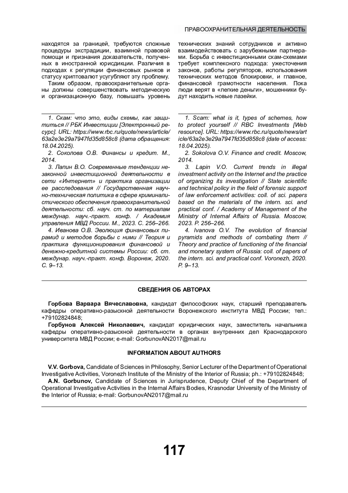 3. Лапин В.О. Современные тенденции незаконной инвестиционной деятельности в сети “Интернет” и практика организации ее расследования // Государственная научно-техническая политика в сфере криминалистического обеспечения правоохранительной деятельности: сб. науч. ст. по материалам междунар. науч.-практ. конф. / Академия управления МВД России. М., 2023. С. 256-266. EDN: LQLAIP