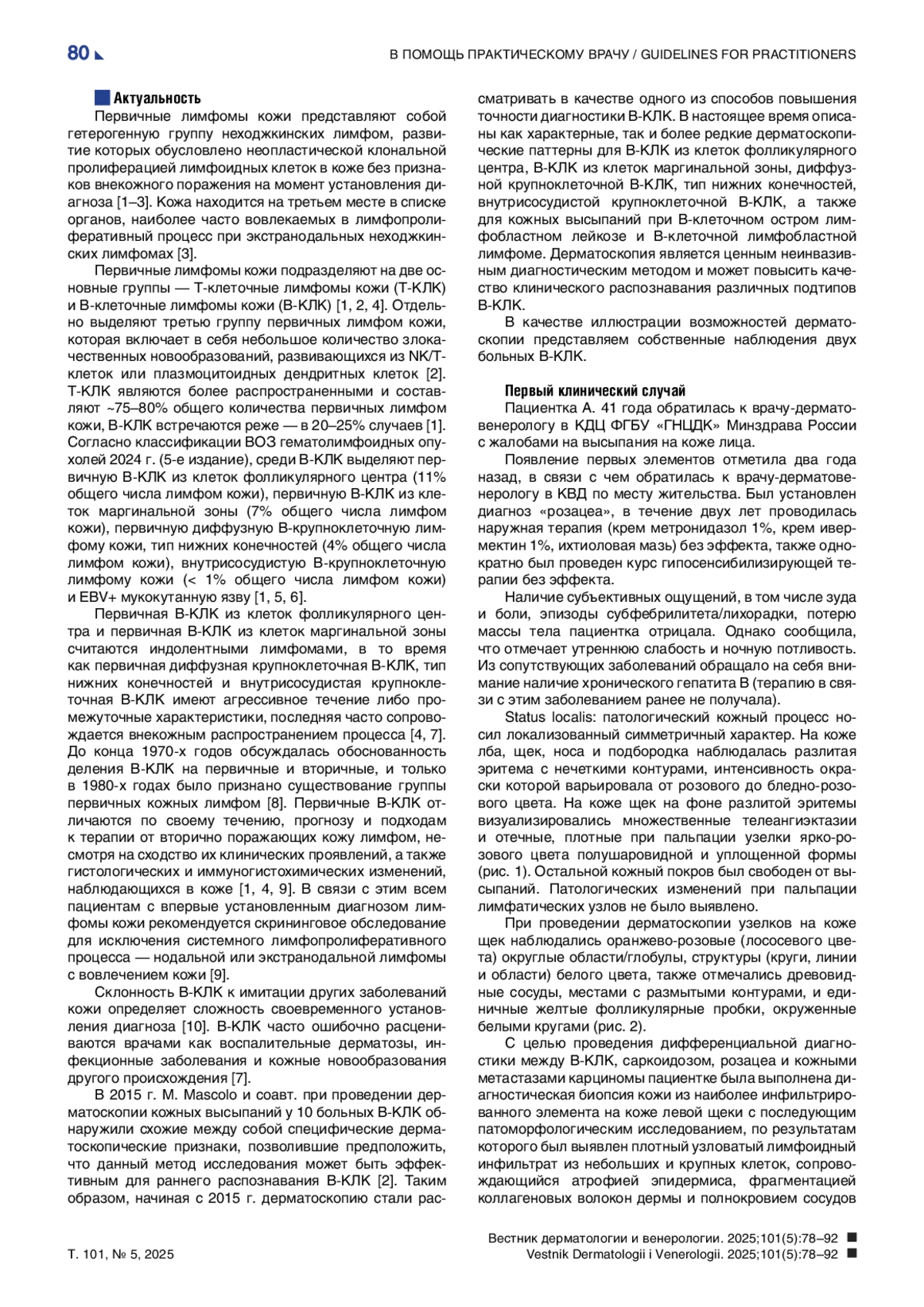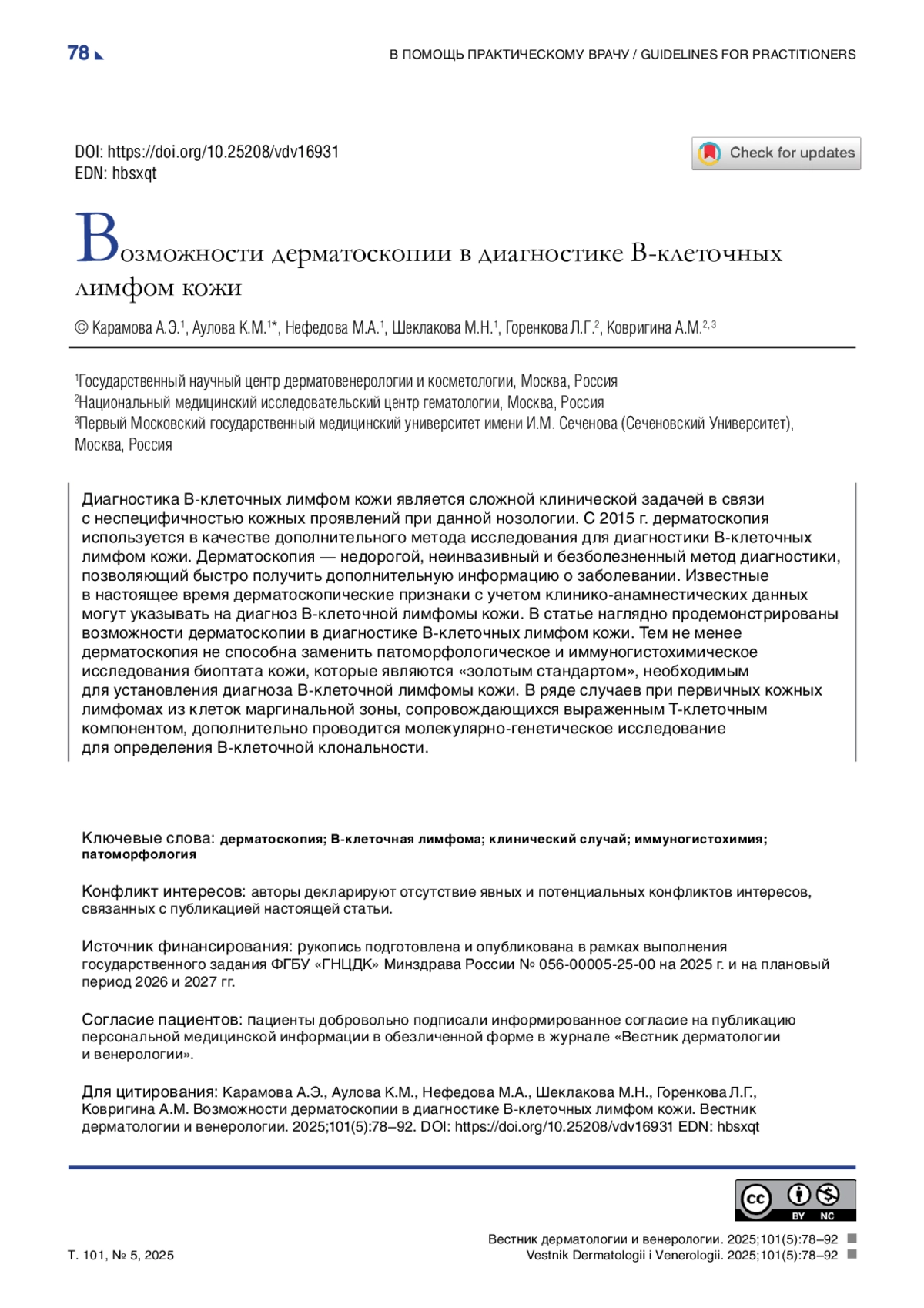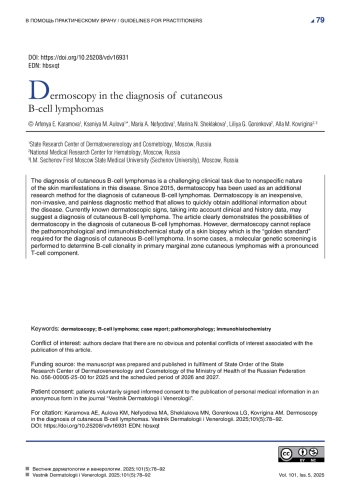 Диагностика В-клеточных лимфом кожи является сложной клинической задачей в связи с неспецифичностью кожных проявлений при данной нозологии. С 2015 г. дерматоскопия используется в качестве дополнительного метода исследования для диагностики В-клеточных лимфом кожи. Дерматоскопия — недорогой, неинвазивный и безболезненный метод диагностики, позволяющий быстро получить дополнительную информацию о заболевании. Известные в настоящее время дерматоскопические признаки с учетом клинико-анамнестических данных могут указывать на диагноз В-клеточной лимфомы кожи. В статье наглядно продемонстрированы возможности дерматоскопии в диагностике В-клеточных лимфом кожи. Тем не менее дерматоскопия не способна заменить патоморфологическое и иммуногистохимическое исследования биоптата кожи, которые являются «золотым стандартом», необходимым для установления диагноза В-клеточной лимфомы кожи. В ряде случаев при первичных кожных лимфомах из клеток маргинальной зоны, сопровождающихся выраженным Т-клеточным компонентом, дополнительно проводится молекулярно-генетическое исследование для определения В-клеточной клональности.