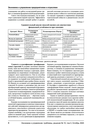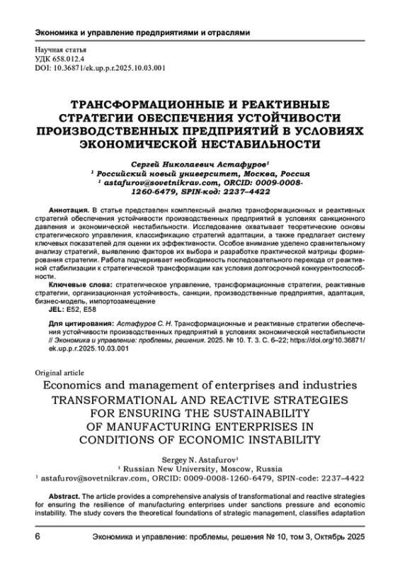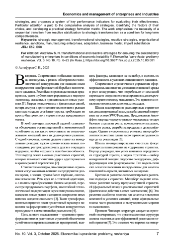 В статье представлен комплексный анализ трансформационных и реактивных стратегий обеспечения устойчивости производственных предприятий в условиях санкционного давления и экономической нестабильности. Исследование охватывает теоретические основы стратегического управления, классификацию стратегий адаптации, а также предлагает систему ключевых показателей для оценки их эффективности. Особое внимание уделено сравнительному анализу стратегий, выявлению факторов их выбора и разработке практической матрицы формирования стратегии. Работа подчеркивает необходимость последовательного перехода от реактивной стабилизации к стратегической трансформации как условия долгосрочной конкурентоспособности.