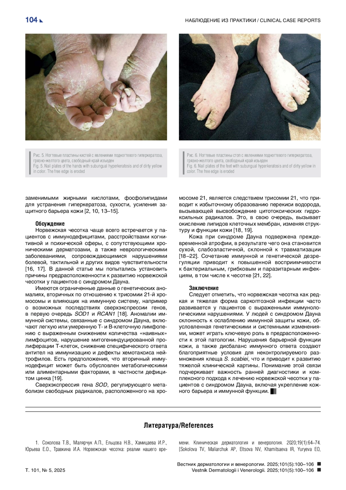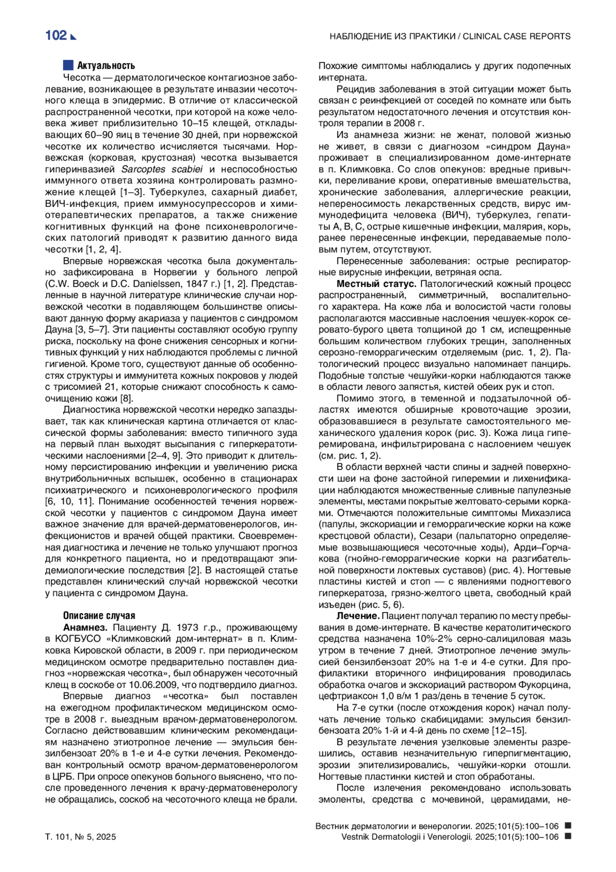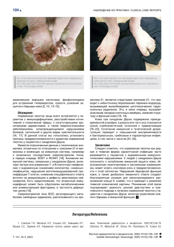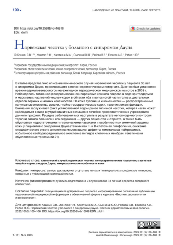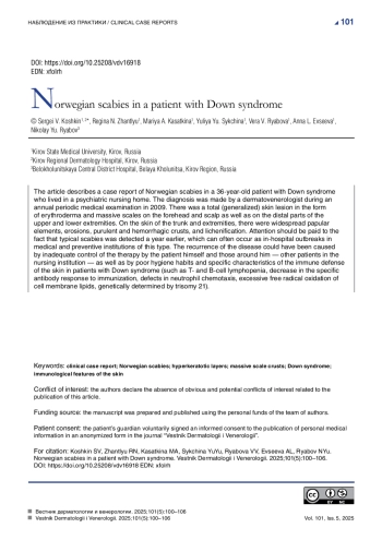 В статье представлено описание клинического случая норвежской чесотки у пациента 36 лет с синдромом Дауна, проживающего в психоневрологическом интернате. Диагноз был установлен врачом-дерматовенерологом на ежегодном периодическом медицинском осмотре в 2009 г. Наблюдалось тотальное (генерализованное) поражение кожного покрова в виде эритродермии и массивных наслоений чешуек-корок в области лба и волосистой части головы, дистальных отделов верхних и нижних конечностей. На коже туловища и конечностей — распространенные папулезные элементы, эрозии, гнойно-геморрагические корки, явления лихенификации. Внимания заслуживает факт установленной годом ранее типичной чесотки, которая часто может наблюдаться в виде внутрибольничных вспышек в лечебно-профилактических учреждениях данного профиля. Рецидив заболевания мог наступить в результате неполноценного контроля терапии самого больного и его окружения — других пациентов интерната, а также быть обусловлен недостаточными гигиеническими навыками и особенностями иммунной защиты кожи у пациентов с синдромом Дауна (такими как Т- и В-клеточная лимфопения, снижение специфического ответа антител на иммунизацию, дефекты хемотаксиса нейтрофилов, избыточное свободнорадикальное окисление липидов клеточных мембран, генетически обусловленные трисомией 21).