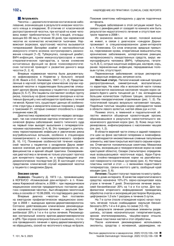 Чесотка — дерматологическое контагиозное заболевание, возникающее в результате инвазии чесоточного клеща в эпидермис. В отличие от классической распространенной чесотки, при которой на коже человека живет приблизительно 10–15 клещей, откладывающих 60–90 яиц в течение 30 дней, при норвежской чесотке их количество исчисляется тысячами. Норвежская (корковая, крустозная) чесотка вызывается гиперинвазией Sarcoptes scabiei и неспособностью иммунного ответа хозяина контролировать размножение клещей [1–3]. Туберкулез, сахарный диабет, ВИЧ-инфекция, прием иммуносупрессоров и химиотерапевтических препаратов, а также снижение когнитивных функций на фоне психоневрологических патологий приводят к развитию данного вида чесотки [1, 2, 4].