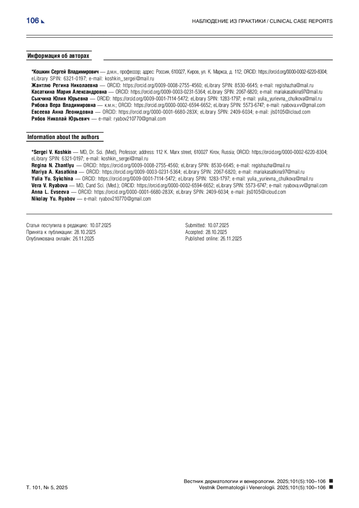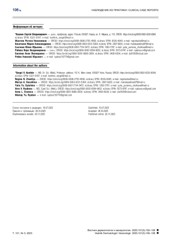6. Карачева Ю.В., Смыкова А.Н., Зейб А.В., Ковалева Я.А., Юневич А.С. К вопросу диагностики норвежской чесотки на примере клинического случая. Российский журнал кожных и венерических болезней. 2022;25(2):133-139. DOI: 10.17816/dv107138