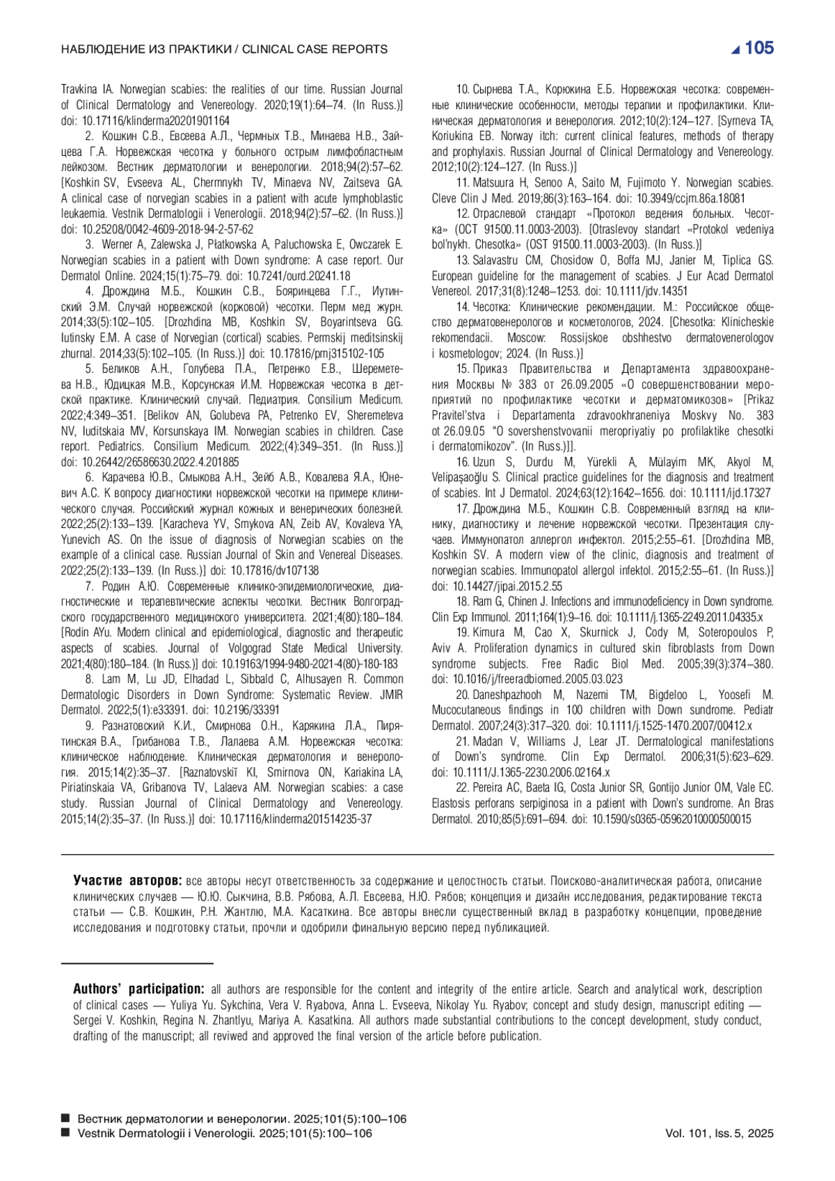 9. Разнатовский К.И., Смирнова О.Н., Карякина Л.А., Пирятинская В.А., Грибанова Т.В., Лалаева А.М. Норвежская чесотка: клиническое наблюдение. Клиническая дерматология и венерология. 2015;14(2):35-37. DOI: 10.17116/klinderma201514235-37
