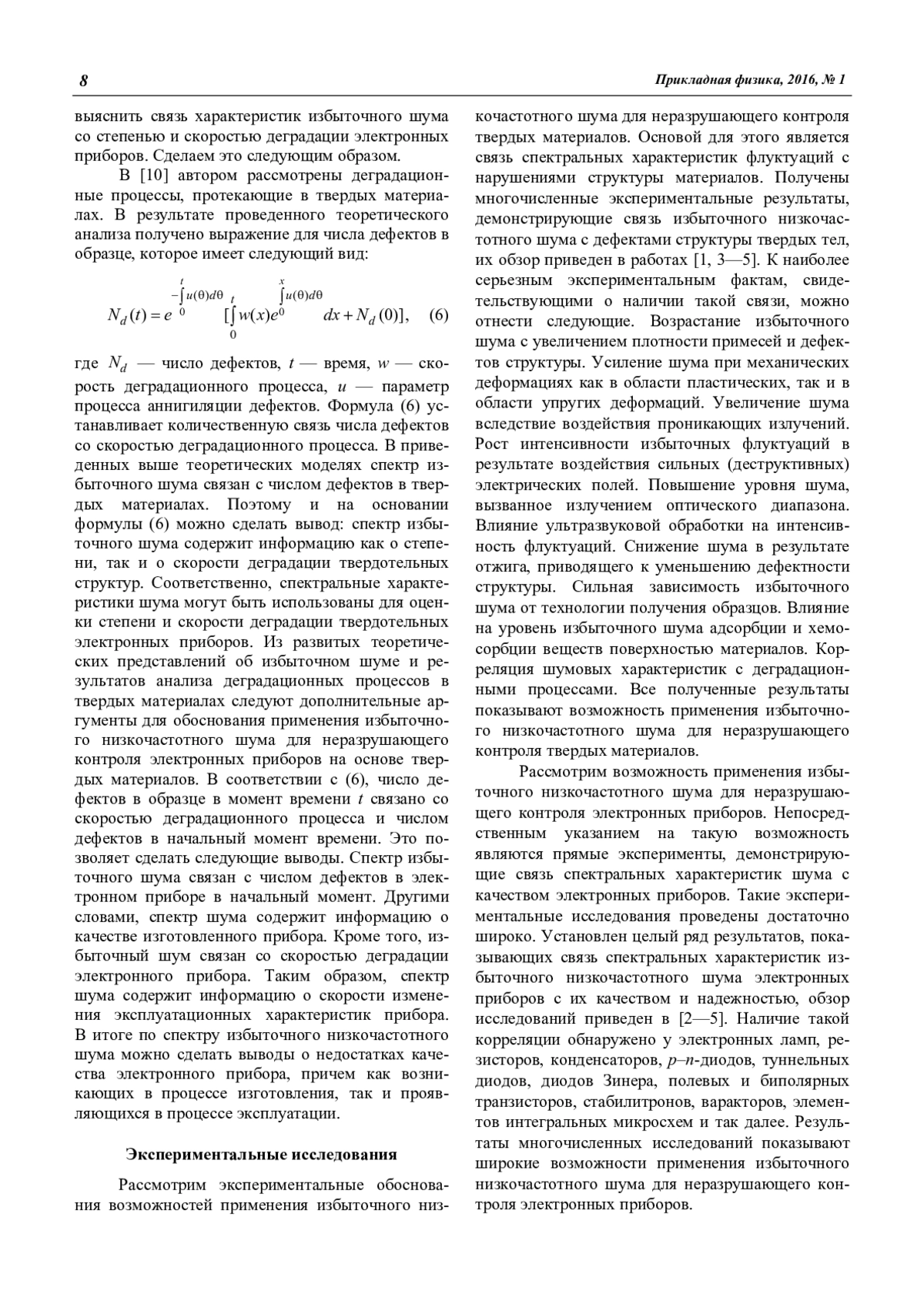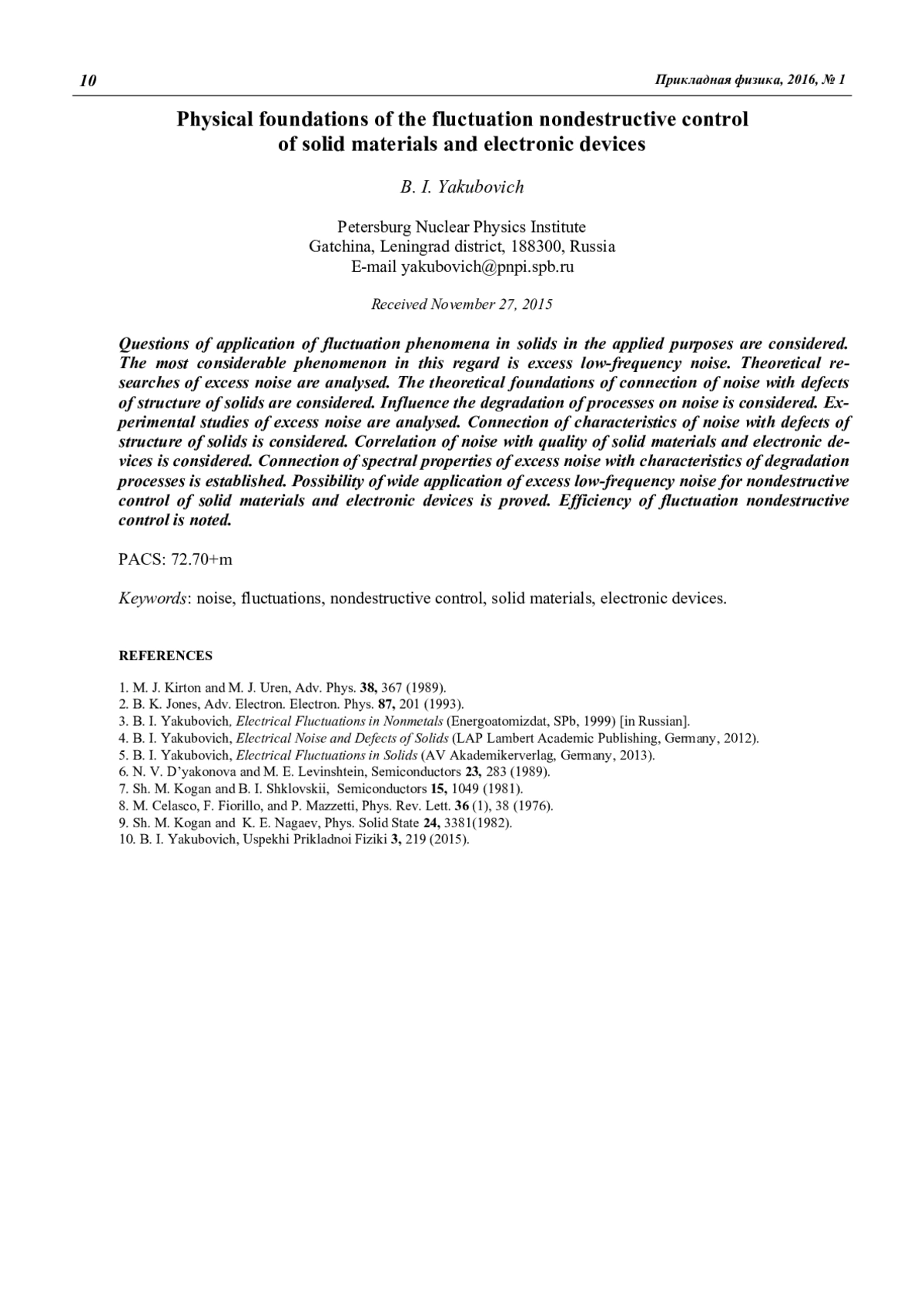 Рассмотрены вопросы применения флуктуационных явлений в твердых телах в прикладных целях. Наиболее значительным явлением в этом отношении является избыточный низкочастотный шум. Проанализированы теоретические исследования избыточного шума. Рассмотрены теоретические основания связи шума с дефектами структуры твердых тел. Рассмотрено влияние деградационных процессов на шум. Проанализированы экспериментальные исследования избыточного шума. Рассмотрена связь характеристик шума с дефектами структуры твердых тел. Рассмотрена корреляция шума с качеством твердых материалов и электронных приборов. Установлена связь спектральных свойств избыточного шума с характеристиками деградационных процессов. Обоснована возможность широкого применения избыточного низкочастотного шума для неразрушающего контроля твердых материалов и электронных приборов. Отмечена эффективность флуктуационного неразрушающего контроля.