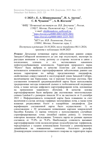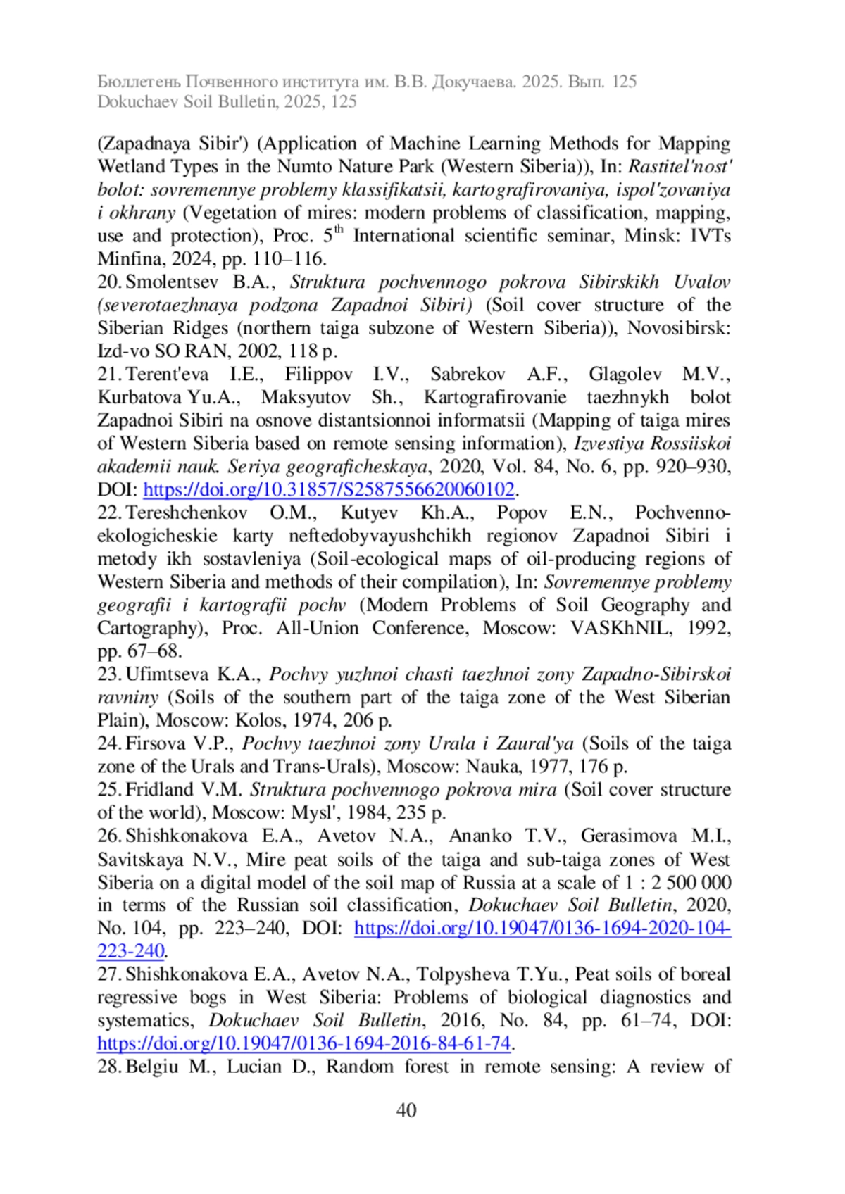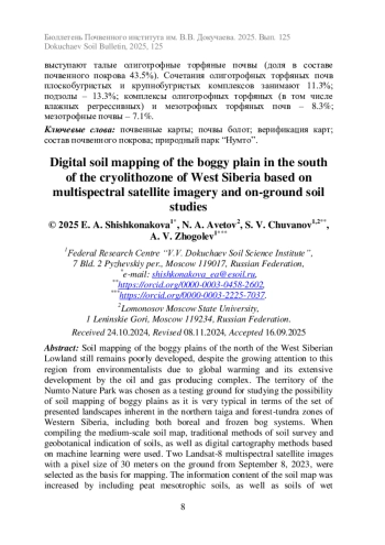 2. Аветов Н.А., Шишконакова Е.А., Кинжаев Р.Р., Арзамазова А.В. Структура почвенного покрова заболоченной равнины северо-таежной подзоны Западной Сибири (бассейн р. Казым) // Почвоведение. 2022. № 2. С. 208-218. DOI: 10.31857/S0032180X22020046