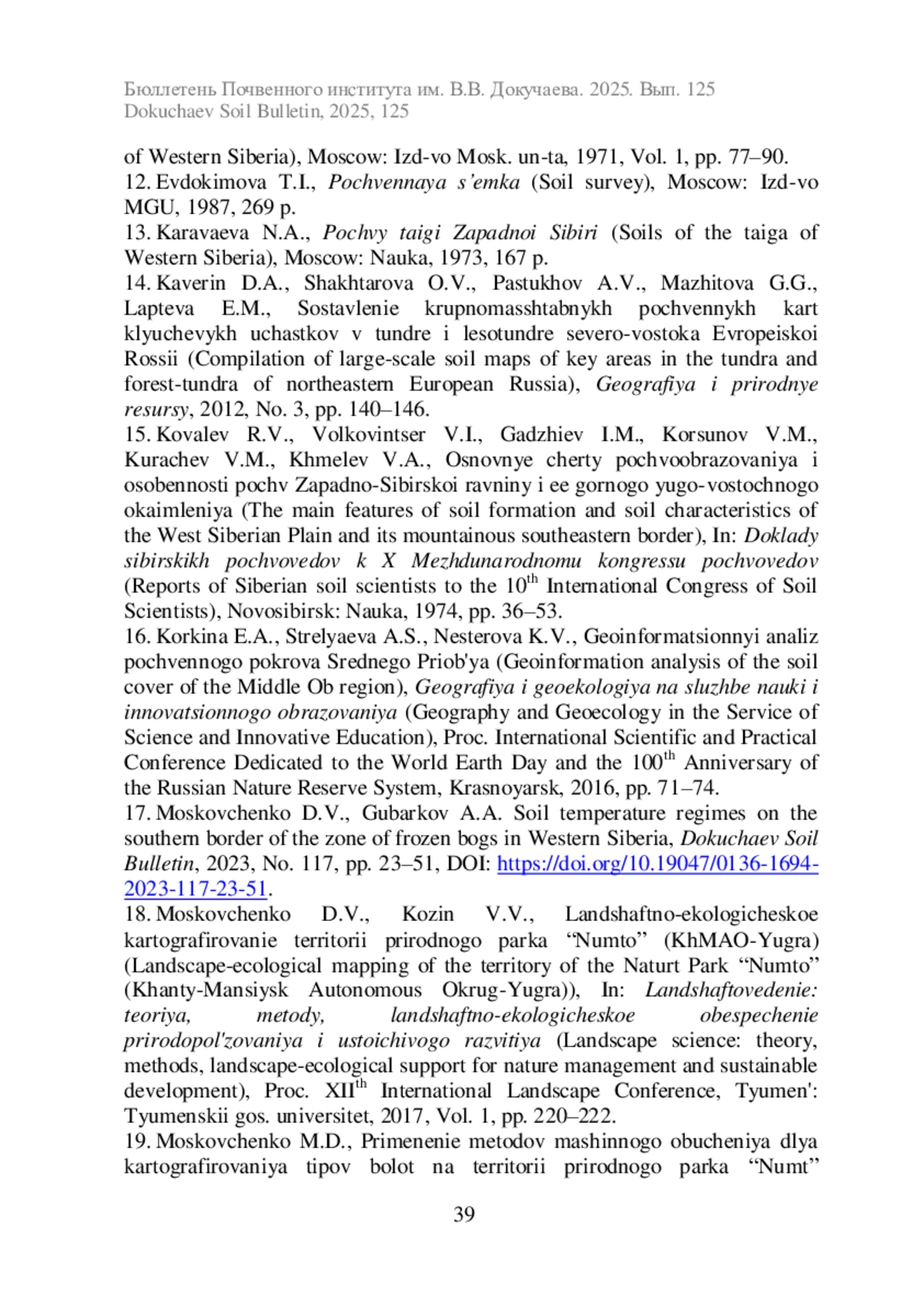 17. Московченко Д.В., Губарьков А.А. Температурные режимы почв на южной границе зоны мерзлых болот в Западной Сибири // Бюллетень Почвенного института им. В.В. Докучаева. 2023. Вып. 117. С. 23-51. DOI: 10.19047/0136-1694-2023-117-23-51
