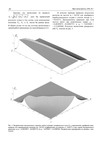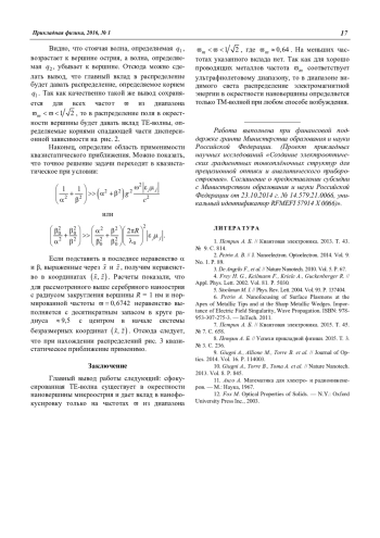 Главный вывод работы следующий: сфокусированная TE-волна существует в окрестности нановершины микроострия и дает вклад в нанофокусировку только на частотах из диапазона m 1 2, где m 0,64. На меньших частотах указанного вклада нет. Так как для хорошо проводящих металлов частота m соответствует ультрафиолетовому диапазону, то в диапазоне видимого света распределение электромагнитной энергии в окрестности нановершины определяется только TM-волной при любом способе возбуждения.