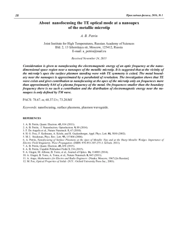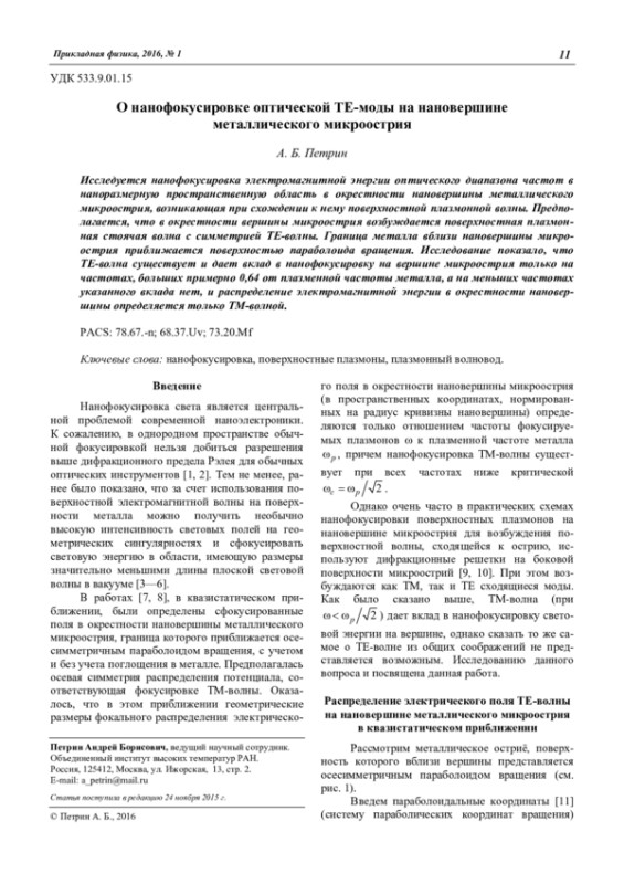 Петрин А. Б. О нанофокусировке оптической TE-моды на нановершине металлического микроострия 11