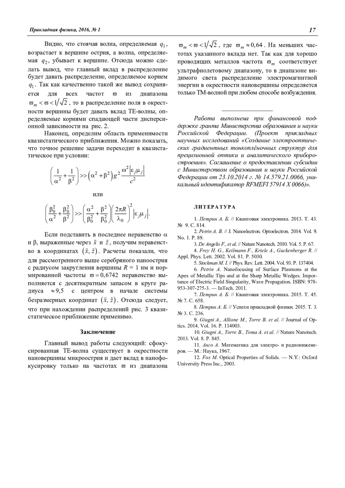 6. Petrin A. Nanofocusing of Surface Plasmons at the Apex of Metallic Tips and at the Sharp Metallic Wedges. Importance of Electric Field Singularity, Wave Propagation. - InTech. 2011. ISBN: 978-953-307-275-3