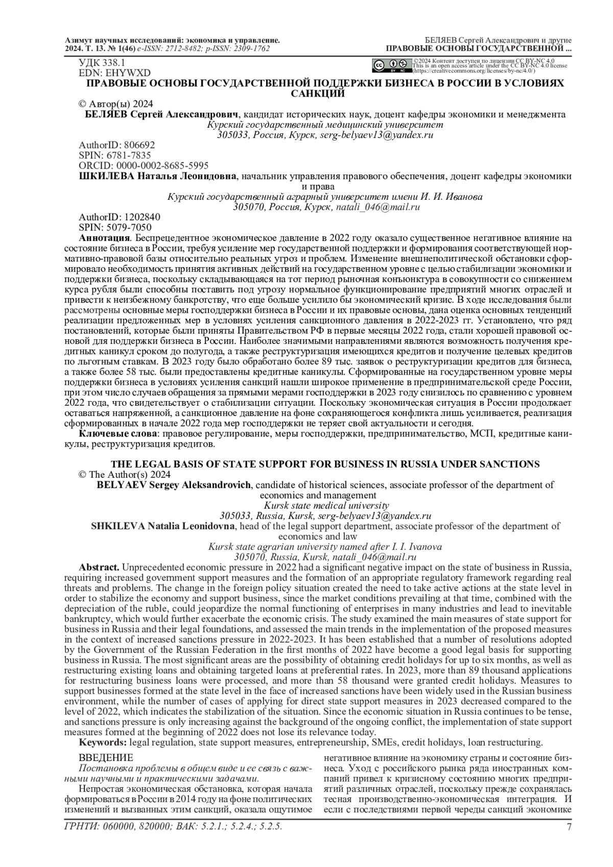 18. Абанина И.Н., Минчичова В.С. Государственная поддержка малого и среднего бизнеса в России в условиях санкций // Самоуправление. 2022. № 5 (133). С. 97-100. EDN: CSWODR