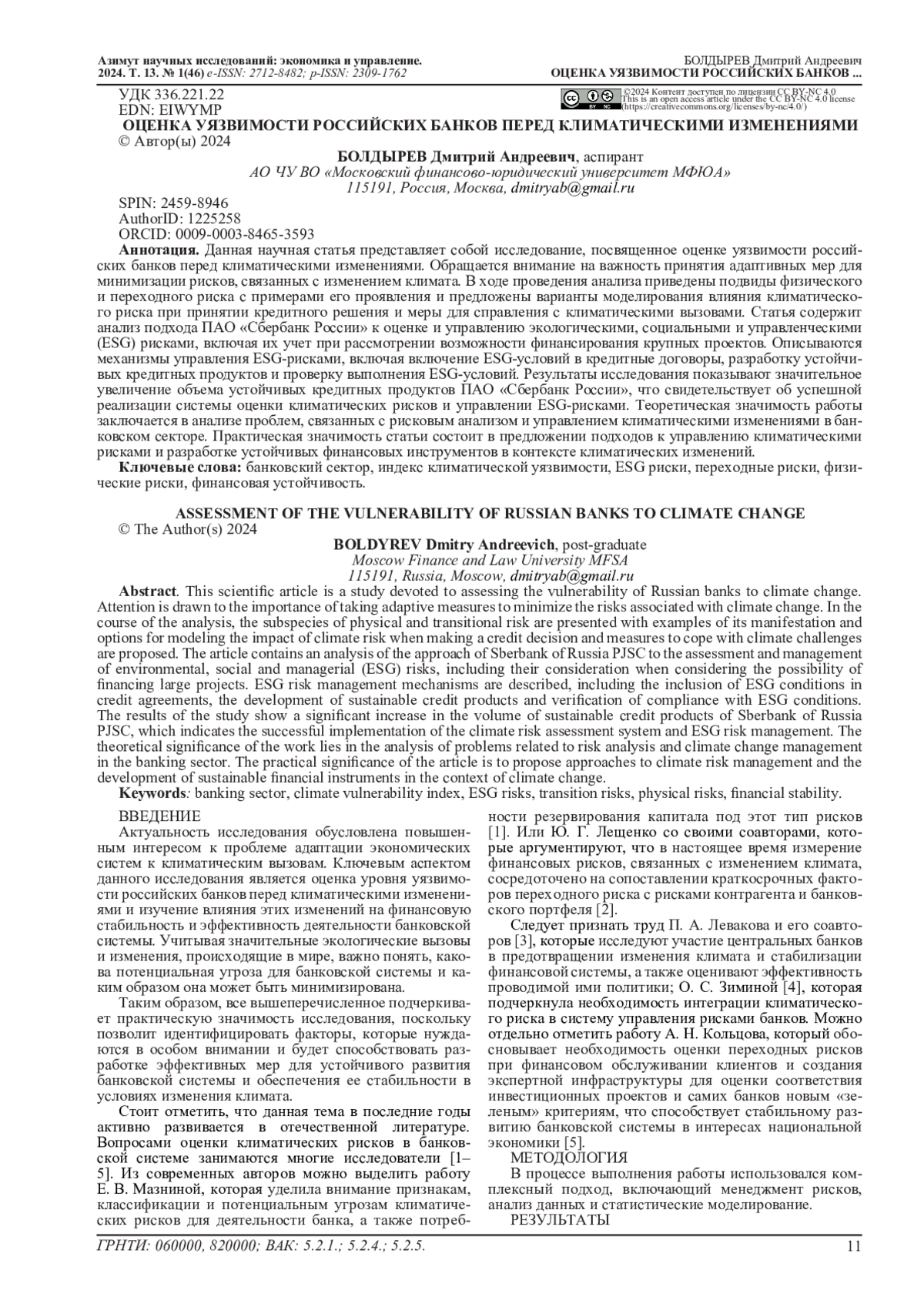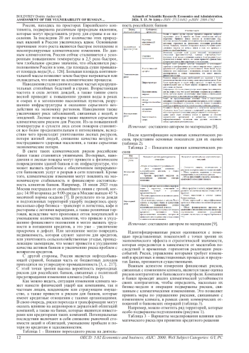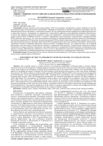 Актуальность исследования обусловлена повышенным интересом к проблеме адаптации экономических систем к климатическим вызовам. Ключевым аспектом данного исследования является оценка уровня уязвимости российских банков перед климатическими изменениями и изучение влияния этих изменений на финансовую стабильность и эффективность деятельности банковской системы.